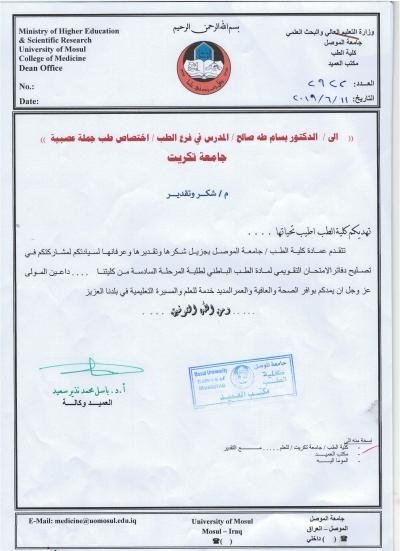 عمادة كلية الطب جامعة الموصل توجه كتابي شكر وتقدير إلى تدريسيين من كلية الطب لجامعتي كركوك وتكريت