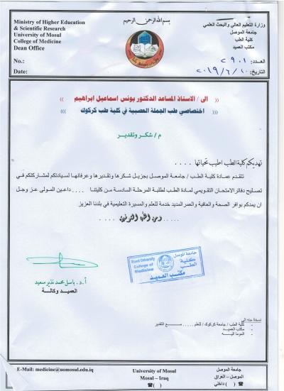 وجهت عمادة كلية الطب جامعة الموصل كتابي شكر وتقدير إلى تدريسيين اثنين من كلية الطب لجامعتي كركوك وتكريت، وذلك في 10 و 11 حزيران 2019. فقد تمّ توجيه كتاب شكر وتقدير إلى الأستاذ المساعد الدكتور يونس اسماعيل ابراهيم كلية الطب جامعة كركوك. كما تمّ توجيه كتاب مماثل إلى المدرس الدكتور بسام طه صالح كلية الطب جامعة تكريت. ويأتي توجيه هذين الكتابين تقديراً وعرفاناً من الكلية لهما عطفاً على مشاركتهما في تصليح دفاتر الامتحان التقويمي لمادة الطب (المرحلة السادسة)، والذي جرت وقائعه في كلية الطب جامعة الموصل.