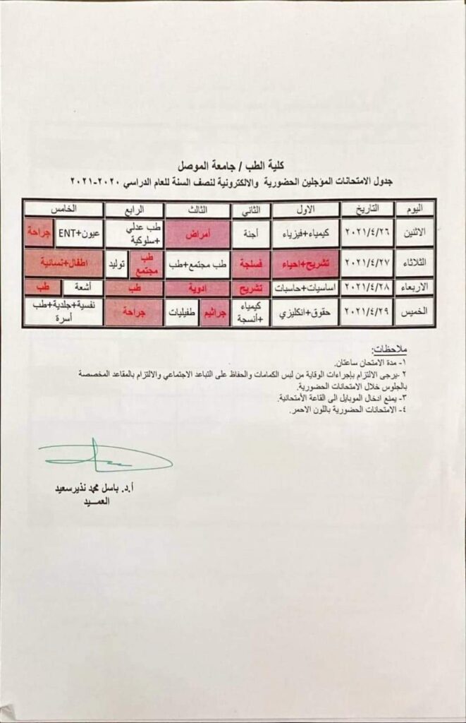 جدول امتحانات المؤجلين الحضورية والالكترونية كلية الطب جامعة الموصل نصف السنة للعام الدراسي 2020 - 2021