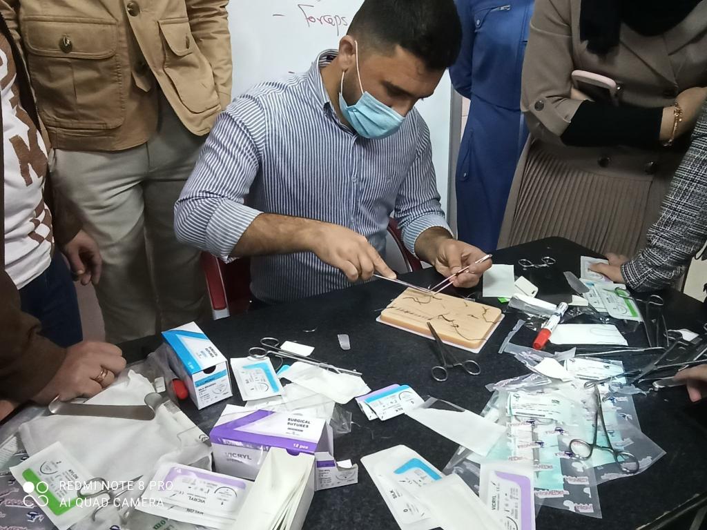 تضمنت شرحاً مفصلاً عن الأدوات الجراحية والخيوط الجراحية وطرق خياطة الجروح وكذلك العقد الجراحية، حيث حاضرَ فيها تدريسي الفرع المدرس الدكتور أبي عبدالعزيز عيدان. وخضعَ للورشة طلاب المرحلة السادسة (مجموعة الجراحة حصراً)، حيث كانت مشاركة الطلبة جيدة وفعّالة.