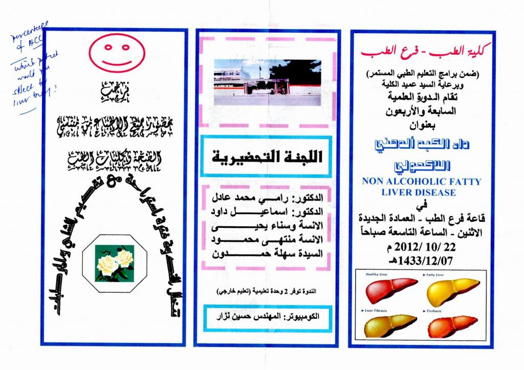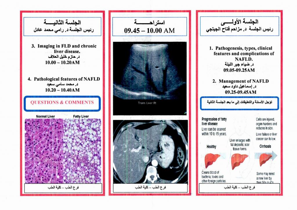 برعاية السيد عميد كلية الطب الدكتور مزاحم فتاح الجيتجي وباشراف الدكتور رامي الحيالي رئيس فرع الطب الباطني اقام فرع الطب الباطني ندوته العلمية الثالثة والاربعين حول مرض الكبد الدهني الاكحولي وذلك يوم الاثنين المصادف 22 تشرين الاول.يعتبر داء الكبد الدهني اللاكحولي من الأمراض الشائعة في العالم ويصاحب عادة بـ "البدانة". هناك دراسات كثيرة حول هذا الداء والذي يعتبر من احد الأسباب الثلاثة الرئيسية لمرض تشمع الكبد (التهاب الكبد الفيروسي، التهاب الكبد الكحولي، داء الكبد الدهني اللاكحولي). هناك عدة مراحل من هذا المرض: المرحلة الأولى: الكبد الدهني البسيط أو الحميد وهذا النوع هو من أكثر الأنواع الشائعة وعادة لا يعاني المريض من أعراض خاصة وفي معظم الأحيان لا يحتاج الى علاج خاص عدا العلاجات التي تعطى لتقليل الوزن وللأمراض المصاحبة مثل ارتفاع ضغط الدم، داء السكري نمط 2، الخلل الناتج من زيادة الدهون الثلاثية وغيرها في الدم، و يطلق على هذه المجموعة المصاحبة اسم "المتلازمة الايضية" والتي غالباّ ما تصاحب هذا الداء. المرحلة الثانية هي مرحلة التهاب الكبد الدهني: في هذه المرحلة يحتاج المريض الى علاجات خاصة مثل الأدوية التي تحفز الأنسولين أو تحفز الاستجابة للانسولين وبالتالي تؤدي الى حرق السعرات الحرارية، وأدوية أخرى مثل فيتامين Eومجموعة الستاتين ( مجموعة من الأدوية تستخدم في علاج ارتفاع الكولسترول وغيرها من الدهونات في الدم)، اضافة الى تغيير في نمط الحياة اليومية من تقليل السعرات الحرارية والرياضة وغيرها. المرحلة الثالثة والمرحلة الرابعة هي من المراحل المتقدمة والتي تصيب القلة من هؤلاء المرضى لا يتجاوز 5 – 10% و تودي الى زيادة التليفات وبالتالي الى تشمع الكبد وما يصاحبها من المضاعفات الأخرى مثل زيادة في الضغط ألبوابي وأورام الكبد الخبيثة.الأعراض والعلامات السريرية: 1. على الأغلب لا يعاني المريض من أعراض خاصة بسب المرض وخاصة في المراحل الأولى من المرض ولكنه قد يعاني من ارتفاع ضغط الدم، داء السكر، ارتفاع نسبة الدهون في الدم اضافة الى البدانة و كما أسلفنا آنفا.2. قد يلاحظ عند فحص المريض وجود تضخم في الكبد.3. في الحالات الاكثر تقدما يعاني المريض من كسل وإعياء ونحول عام.4. في المراحل المتقدمة تظهر أعراض وعلامات أخرى كبقية أمراض الكبد المزمنة.التشخيص:بعد الاشباه بوجود المرض وخاصة بوجود اعراض وعلامات " التناذر الايضي" وتستخدم الوسائل التالية لاثبات التشخيص:· فحوصات وظائف الكبد.· التصوير الطبي ألشعاعي.· خزعة الكبد والفحص النسيجي: تعتبر هذه الوسيلة من أهم الوسائل والأكثر اعتماداّ في التشخيص.مكان انعقاد الندوة:كلية الطب – بناية العمادة الجديدة – قاعة فرع الطب.تاريخ انعقاد الندوة:22 /10/2012 وبحضور السيد عميد الكلية.المدة والوقت:ساعتان من 9 صباحاّ – 11 صباحاّالفئات المستهدفة: 1. التدريسيون في فروع كلية الطب وخاصة في الفروع السريرية.2. الأطباء العاملون في المستشفيات التعليمية.3. طلبة الدراسات العليا (البورد العراقي والعربي).4. طلبة المرحلة السادسة في كلية الطب.عد الحضور:70 سبعون.عدد الجلسات العلمية:2رؤساء الجلسات:الجلسة الأولى:الدكتور مزاحم فتاح الجيتجي.الجلسة الثانية:الدكتور رامي محمد عادلالمحاضرون:الدكتور: ضياء جبر الليلة – استاذ مساعد في فرع الطب.الدكتور: إسماعيل داود – استاذ مساعد في فرع الطب.الدكتور: حازم خليل العلاف – استاذ مساعد ورئيس فرع الاشعة.الدكتور: محمد سامي مدرس في فرع علم الأمراض.الأهداف:اطلاع المشاركين في الندوة على المستجدات الحديثة في التشخيص والعلاج لداء الكبد الدهني اللاكحولي.البرنامج العلمي:كلمة الافتتاح:للسيد رئيس فرع الطب الدكتور رامي محمد عادل.الجلسة الأولى:تضمنت المحاور التالية: التعريف العلمي للمرض، المسببات والصور السريرية للمرض و التشخيص التفريقي للمرض و مضاعفات المرض. ألقاها المحاضر الدكتور ضياء جبر الليلة. أما المحاضرة الثانية التي ألقاها الدكتور حا