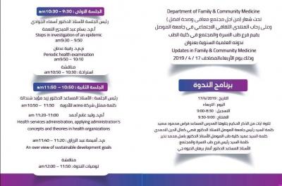 يتشرف فرع طب الاسرة والمجتمع كلية الطب جامعة الموصل بدعوتكم لحضور ندوته العلمية السنوية. وستقام الندوة المذكورة يوم الأربعاء 17 نيسان 2019 في قاعة المنتدى العلمي والأدبي ابتداءاً من الساعة التاسعة صباحاً إن شاء الله.