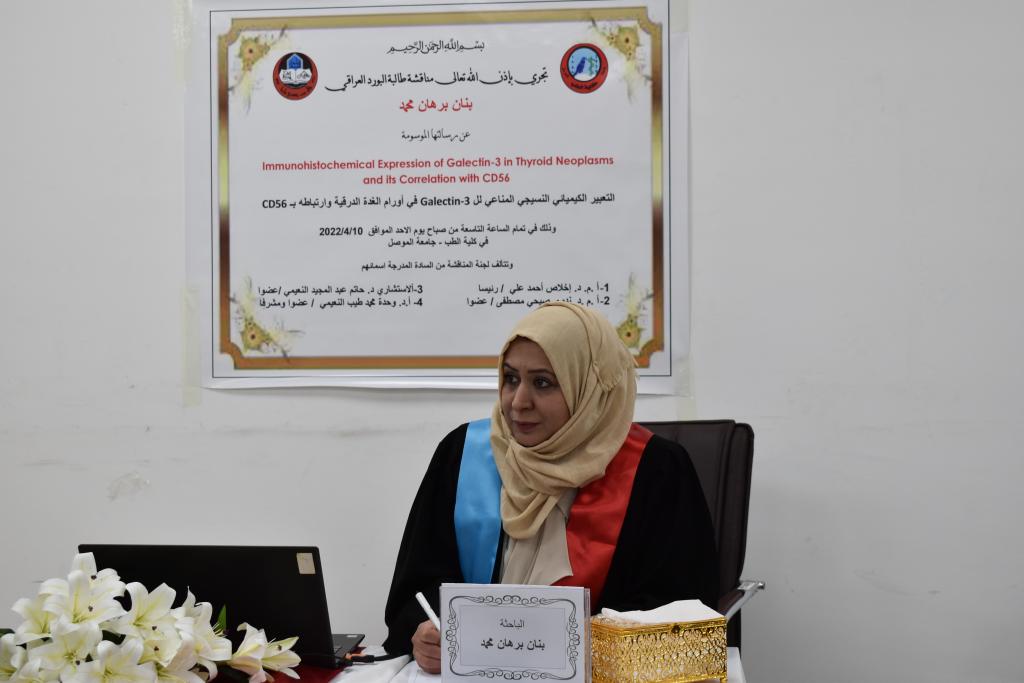 جرت صباح يوم الاحد الموافق 10 نيسان 2022 مناقشة طالبة البورد العراقي في علم الامراض (بنان برهان محمد العبادي ) والموسومة Immunohistochemical Expression of Galectin-3 in Thyroid Neoplasms and its correlation with CD56 , وتألفت لجنة المناقشة من :