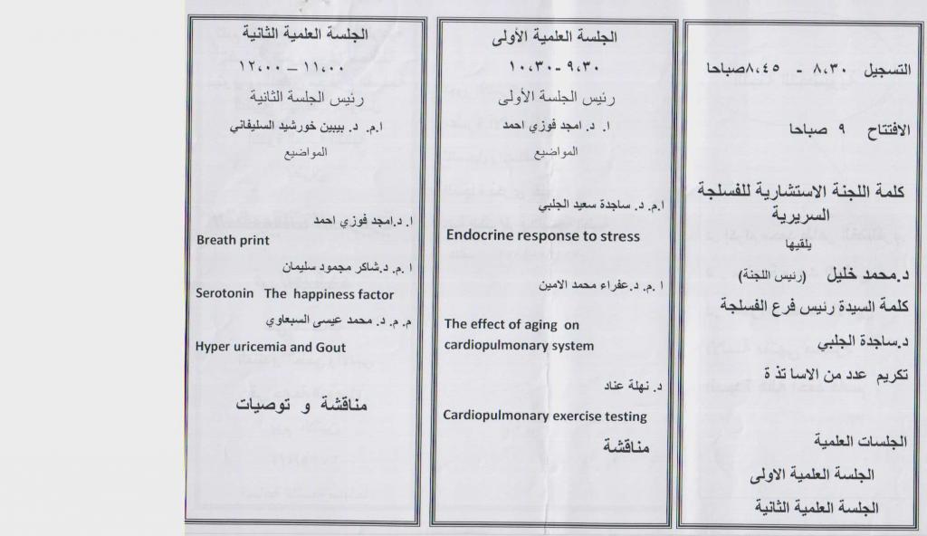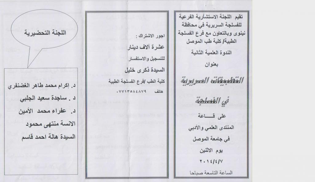 تقيم اللجنة الاستشارية الفرعية للفسلجة السريرية في محافظة نينوى وبالتعاون مع فرع الفسلجة الطبية في كلية الطب الندوة العلمية الثانية بعنوان التطبيقات السريرية في الفسلجة على قاعة المنتدى العلمي والادبي في جامعة الموصل يوم الاثنين المصادف 7 نيسان 2014 الساعة التاسعة صباحا