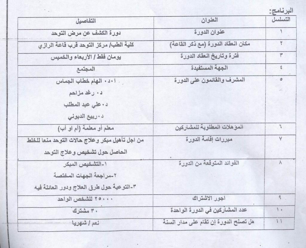 نظرا للحاجة الماسة لتثقيف المجتمع حول مرض التوحد وطرق تأهيل الاطفال المصابين به وتخفيفا للاعباء العائلية تقرر فتح دورات تدريبية شهرية مكثفة وعلى مدى يومين من كل شهر وضمن برنامج معد لذلك ويكون التسجسل في كلية الطب – وحدة البحوث النفسية حسب التعليمات المدرجة في الجدول ادناه