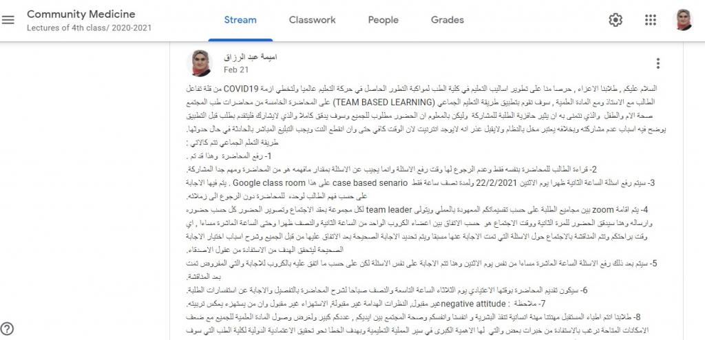 حرصاً من كلية الطب جامعة الموصل على تطوير اساليب التعليم لمواكبة التطور الحاصل في حركة التعليم عالميا ولتخطي ازمة COVID19 التي افرزت قلة تفاعل الطالب مع الاستاذ ومع المادة العلمية، قامت تدريسية فرع طب الأسرة والمجتمع الاستاذ المساعد الدكتورة أميمة عبد الرزاق ابراهيم بتطبيق طريقة التعليم الجماعي (TEAM BASED LEARNING) على محاضرات طب المجتمع صحة الام والطفل لإثارة حافزية طلبة المرحلة الرابعة للمشاركة الفاعلة، وذلك يوم الأحد 21 شباط 2021.