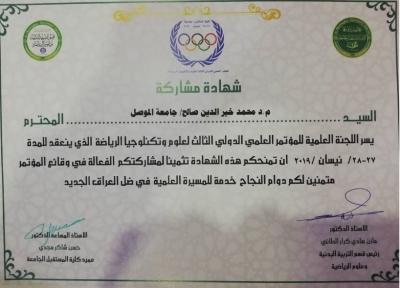 تحت شعار: "الرياضة هدفنا.. وحب العراق يجمعنا"، اقامت كلية المستقبل الجامعة في بابل مؤتمرها الدولي الثالث لعلوم وتكنولوجيا الرياضة، وذلك للفترة من 27 – 28 نيسان 2019. وتواجدت كلية الطب جامعة الموصل في فعاليات هذا المؤتمر عبر اشتراك السيد مسؤول شعبة النشاطات الطلابية المدرس الدكتور محمد خير الدين صالح ببحثه الموسوم: "جودة الحياة التنافسية وعلاقتها بالسلوك التنافسي لدى لاعبي كرة القدم". وقد كان عدد البحوث المقدمة إلى المؤتمر بحدود 600 بحث، تم قبول 80 بحثاً فقطمن العرب والعراقيين، تم عرض ملخصاتها على مدى يومينِ متتاليينِ.