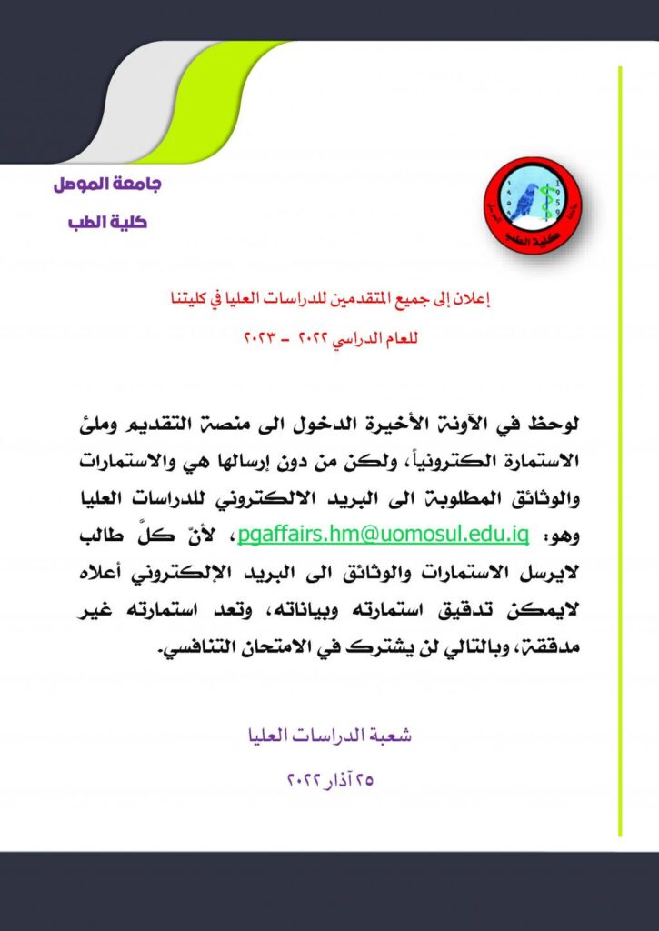 إعلان الى المتقدمين للدراسات العليا في كلية الطب جامعة الموصل للعام الدراسي 2022 - 2023