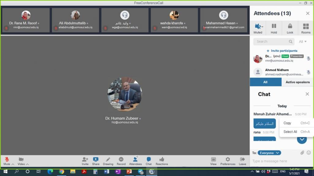 أقيمت الورشة افتراضياً برعاية عميد الكلية الأستاذ الدكتور باسل محمد نذير سعيد، وبحضور المعاون العلمي الأستاذ المساعد الدكتور همام غانم ابراهيم ولفيف من تدريسيي الكلية وطلبة الدراسات العليا.