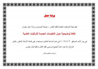 يسر لجنة الترقيات العلمية كلية الطب جامعة الموصل أن تدعوكم لحضور ورشة العمل: نقاط توضيحية حول التعليمات الجديدة للترقيات العلمية. وستقام هذه الورشة يوم الأحد 13 كانون الثاني 2019 في قاعة الأستاذ الدكتور طاهر الدباغ ابتداءا من الساعة العاشرة صباحاً إن شاء الله ووفق الإعلان المرفق.