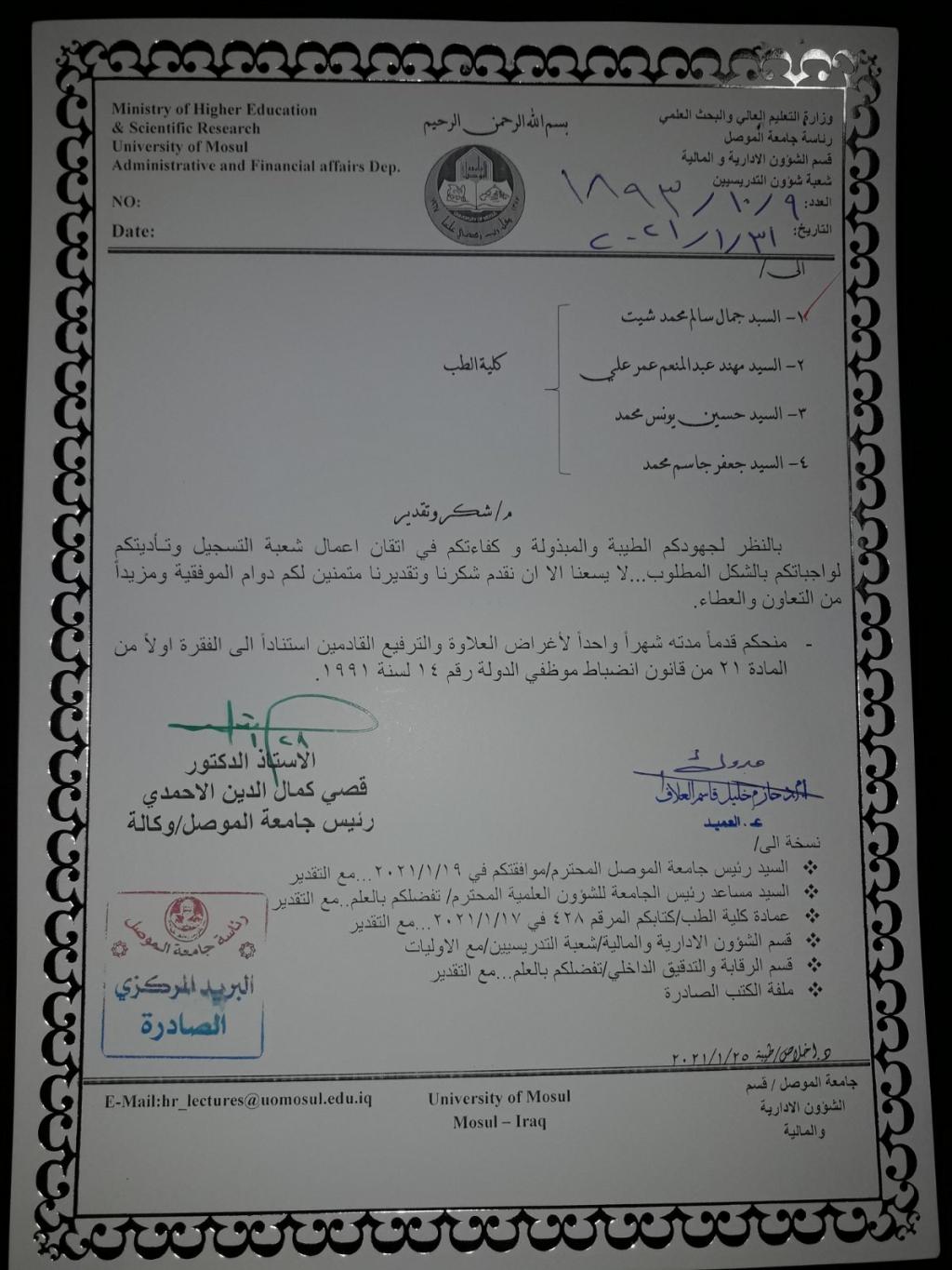 مسؤول وبعض أعضاء شعبة التسجيل كلية الطب جامعة الموصل يحصلون على كتاب شكر وتقدير من رئاسة جامعة الموصل