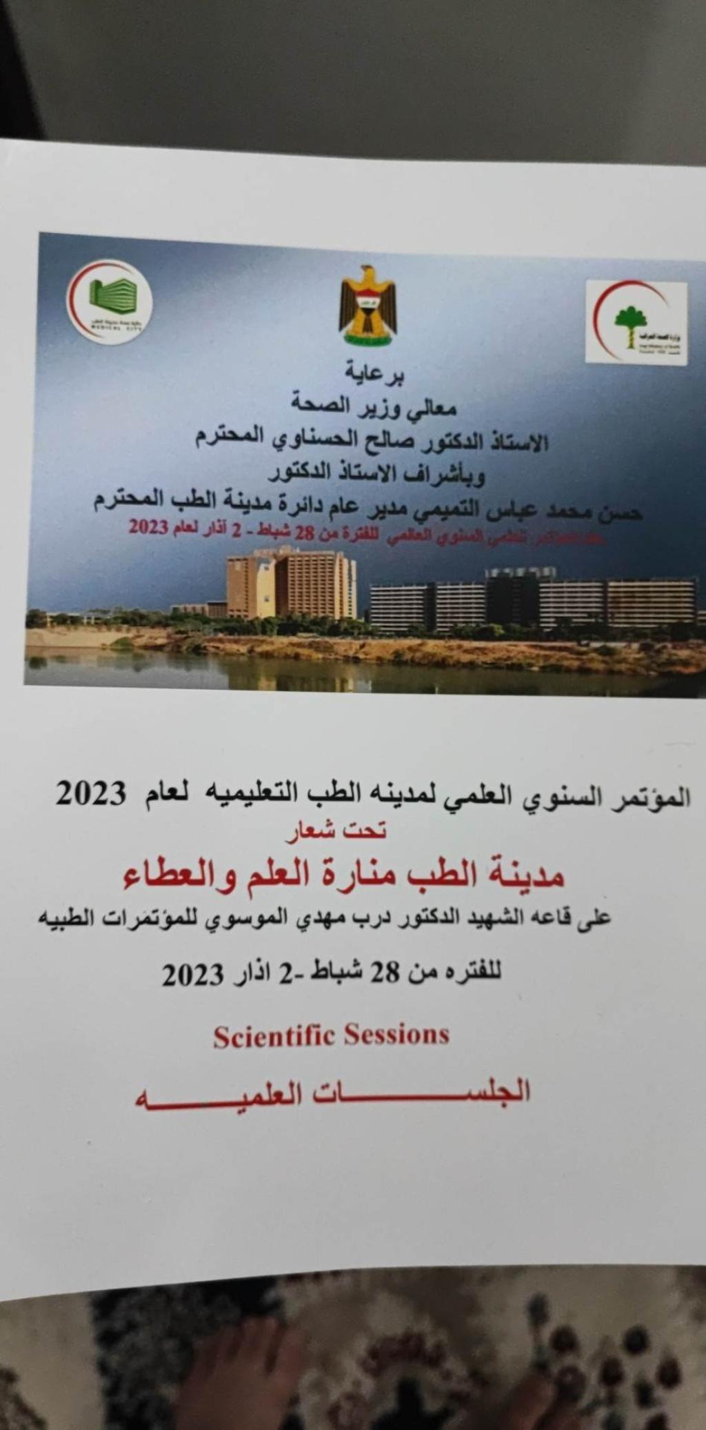 مساهمة تدريسيي فرع الجراحة من كليتنا في المؤتمر العلمي السنوي لمدينة الطب التعليميةشارك الدكتور ابي عبد العزيز والدكتور بسام الحجار بورقة علمية في اعمال مؤتمر مدينة الطب الذي اقيم للفترة 28/2-2/3- من العام 2023وساهمت تدريسية فرع الطب من كليتنا في المؤتمر العلمي السنوي لمدينة الطب التعليميةالاستاذ المساعد الدكتورة علياء عبد العزيز بورقة علمية حول اورام الثدي في اعمال مؤتمر مدينة الطب السنوي الذي اقيم للفترة 28/2-2/3- من العام 2023