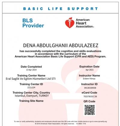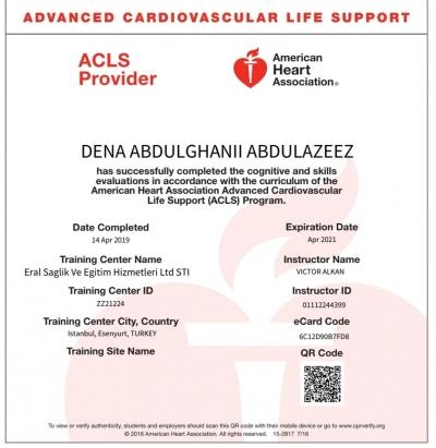 اشتركت المدرس الدكتورة دينا عبدالغني القزاز تدريسية شعبة التخدير فرع الجراحة كلية الطب جامعة الموصل في كورسينِ تدريبينِ اثنينِ حول دعم الحياة الأساسية والإنعاش القلبي، وذلك للفترة 13 – 14 نيسان 2019 في تركيا. فقد ضَيَّفَتْ جامعةُ باهشيشهر في اسطنبولBahçeşehir University /Istanbulفي المستشفى التابع لها وبالتعاون مع الجمعية الامريكية للقلبAmerican Heart Associationهذين الكورسينِ التدريبيينِ. خُصِّصَ الأولُ منهما لدعم الحياة الأساسيةBLS ، والثاني للإنعاش القلبي المتقدمACLS. وقد اشترك فيهما كذلك (علاوة على الدكتورة المذكورة) أطباء من العراق والأردن وليبيا. وفي نهاية الدورة، تم تسليم المشاركينَ شهادات حضور واجتياز هاتين الدورتين.