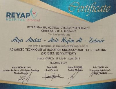 من أجل تطوير المهارات الفنية للتدريسيين، أوفدتْ جامعة الموصل التدريسية في فرع الطب الباطني كلية الطب جامعة الموصل المدرس الدكتورة علياء عبدالعزيز نجم (دكتوراه سريرية في طب الأورام والعلاج الإشعاعي) من أجل الاشتراك بدورة تدريبية على التقنيات الحديثة للعلاج الاشعاعي للاورام، وذلك للفترة من 29 تموز 2018 لغاية 24 آب 2018. ولقد أُقيمت الدورة المذكورة في مستشفى رياب التخصصي التابعة لجامعة روميلي في مدينة اسطنبول التركية. وقد تمّ التدريب على جهازTrueBean Varian For Radiotherapyالمعجل الخطي المتطور. ويعد هذا الجهاز من احدث اجهزة العلاج الاشعاعي للاورام؛ إذ يستخدم تقنية العلاج الاشعاعي التجسيميSRS Stereotactic Radiosurgeryوالعلاج الاشعاعي الستيروتاكتيكي للجسمSBRT Stereotactic body radiotherapy. ويوفر هذا العلاج الاشعاعي جرعات عالية من الاشعة المحورية عبر توجه الاشعاع الى الورم بدقة عالية من خلال جلسة واحدة فقط، أو عدد محدود من الجلسات، من دون التاثير على الانسجة السليمة المحيطة للورم. ومما يذكر في هذا الصدد أن التصوير المقطعي بالاصدار البسترونيPET-CT Positron Emission Tomography يعد تقنيةَ تصويرٍ ثلاثية الإبعاد (في الطب النووي)؛ إذْ تتيحُ هذه التقنية تبيان اعضاء الجسم وما قد يكون فيها من ورم سرطاني او نقيلات سرطانية. كما يمكن بواسطتها تفقد مختلف العمليات الوظيفية في الجسم.