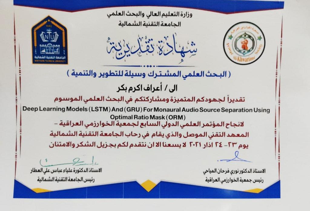 برعاية رئاسة الجامعة التقنية الشمالية، أقامت جمعية الخوارزمي العراقية والمعهد التقني الموصل المؤتمرَ العلمي الدولي السابع: “البحث العلمي المشترك وسيلة للتطوير والتنمية”، وذلك للفترة 23 – 24 آذار 2021. وقد اشترك في فعاليات المؤتمر عشرات الأكاديميين والباحثين من مختلف الجامعات العراقية، من بينهم مسؤول وحدة الدعم الفني شعبة ضمان الجودة وتقويم الاداء كلية الطب جامعة الموصل المدرس المساعد أعراف أكرم بكر عن بحثه الموسوم: Deep Learning Models (LSTM) and (GRU) for Monaural Audio Source Separation Using Optimal Ratio Mask (OMR). وبلغ عدد البحوث المقدَّمة 127 بحثاً موزعة على عدة محاور كالرياضيات والإحصاء والفيزياء والحاسوب وعلوم الحياة وغيرها، والتي من المؤمل نشرها فيما بعد في مستوعبات نشر عالمية رصينة.