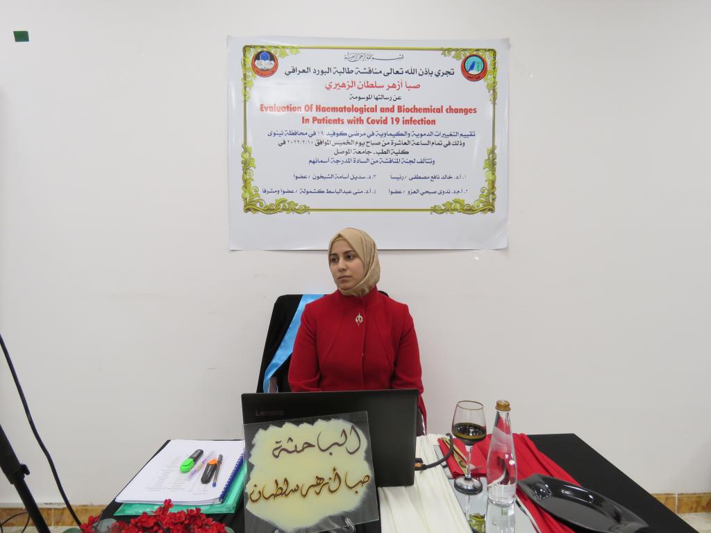 ناقشَ بحثُ تخرج طالبة البورد العراقي (مركز الموصل) في تخصص أمراض الدم صبا أزهر سلطان تقييمَ التغيرات الدموية والكيمياوية في مرضى كوفيد 19 لمحافظة نينوى، وذلك يوم الخميس 10 شباط 2022.
