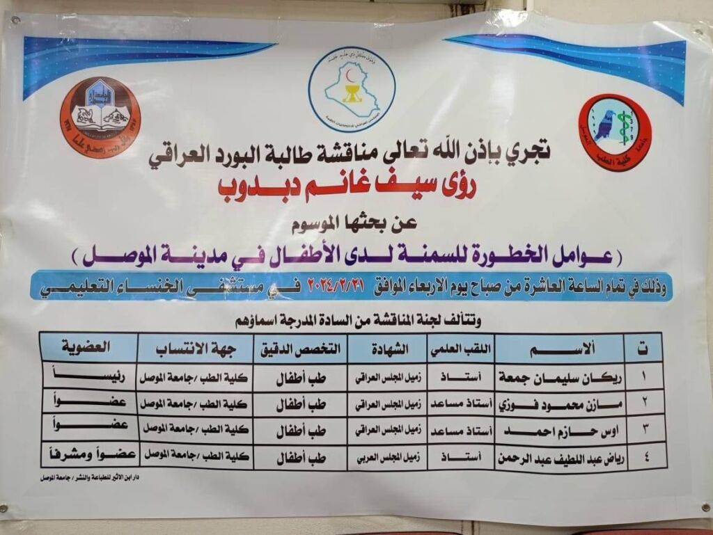 تمت مناقشة طالبة البورد العراقي (بيكرد عبدالله محمد) اختصاص علم الأمراض /النسيج المرضي عن بحثها الموسوم :