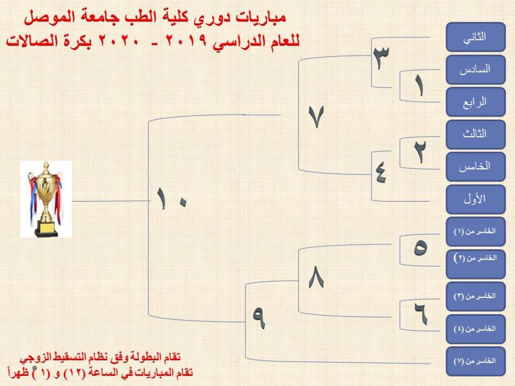 برعاية السيد عميد كلية الطب جامعة الموصل الأستاذ الدكتور باسل محمد نذير سعيد، وبإشراف وحضور السيد مسؤول شعبة النشاطات الطلابية المدرس الدكتور محمد خير الدين صالح، والسيد مدرس التربية الرياضية أحمد مطر، انطلقت بطولة دوري كرة قدم الصالات (خماسي الكرة) للمراحل الدراسية للكلية، وذلك يوم الأحد 20 تشرين الأول 2019. وأسفرت مباراة الافتتاح عن فوز المرحلة الرابعة على المرحلة السادسة بنتيجة ثمانية أهداف مقابل هدفين اثنين. فيما تقابل في المباراة الثانية التي جرت يوم الأربعاء 23 تشرين الأول 2019 فريقا الثالث والخامس، حيث أسفرت عن فوز الخامس على الثالث بنتيجة تسعة أهداف مقابل ثلاثة. وحسب مرتسم جدول المباريات، وازاء النتيجتين أعلاه، سيلتقي في المباراة الثالثة من البطولة فريقا الرابع مع الثاني (كان عنده انتظار). في حين تجمع المباراة الرابعة فريقا الخامس مع الأول (كان عنده انتظار) وذلك بعد انتظامهم في الدوام نهاية تشرين الأول 2019. بينما تشهد المباراة السادسة لقاء الخاسرينِ مع بعضهما (السادس والثالث)، والخاسر منهما هذه المرة سيودع البطولة بشكل نهائي. وتشترك في هذ المنافسات التي تقام وفق نظام التسقيط الزوجي (خروج المغلوب من مباراتين) ست فرق تمثل المراحل الدراسية لكلية الطب.