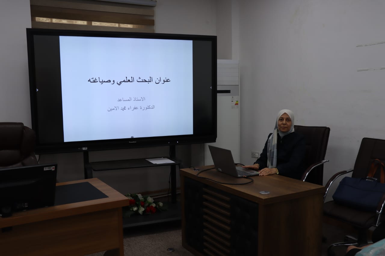 وقد استهدفت الورشة طلبة الدراسات العليا في الفروع المختلفة و هدفت الى التعريف بأهمية اختيار وخطوات صياغة عنوان البحث العلمي .