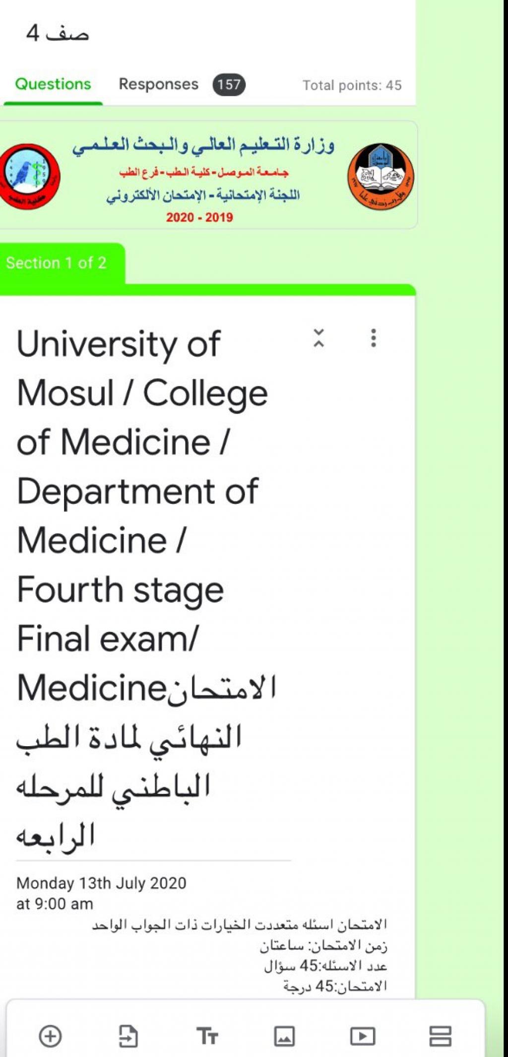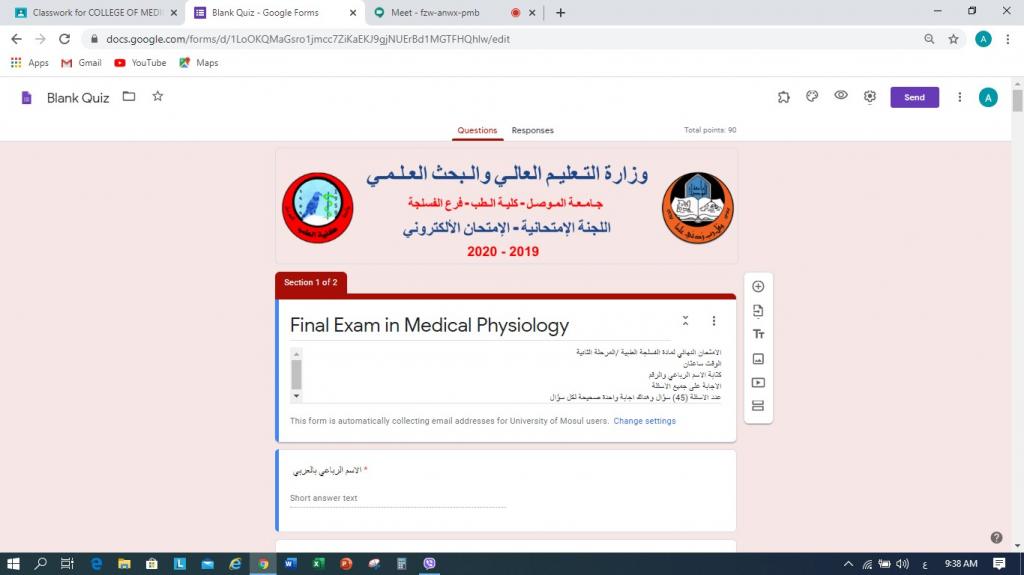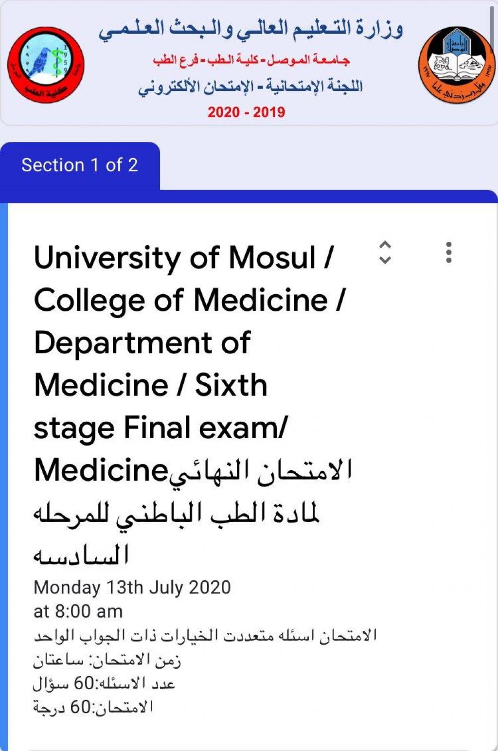 وزارة التعليم ورئاسة الجامعة تتابعان سير الامتحانات النهائية لكلية الطب جامعة الموصل للعام الدراسي 2019 – 2020 إلكترونياً
