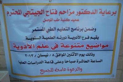 برعاية الدكتور مزاحم فتاح الجيتجي عميد كلية الطب وضمن برنامج التعليم المستمر يقيم فرع الادوية الدورة السنوية بعنوانDifferent topics in pharmacologyوذلك يوم الاثنين المصادف 2013/4/8 وعلى قاعة الدراسات العليا باشراف كل منا.م.د. وحدة بشير اليوزبكيد. شامل هاشم النعيمي