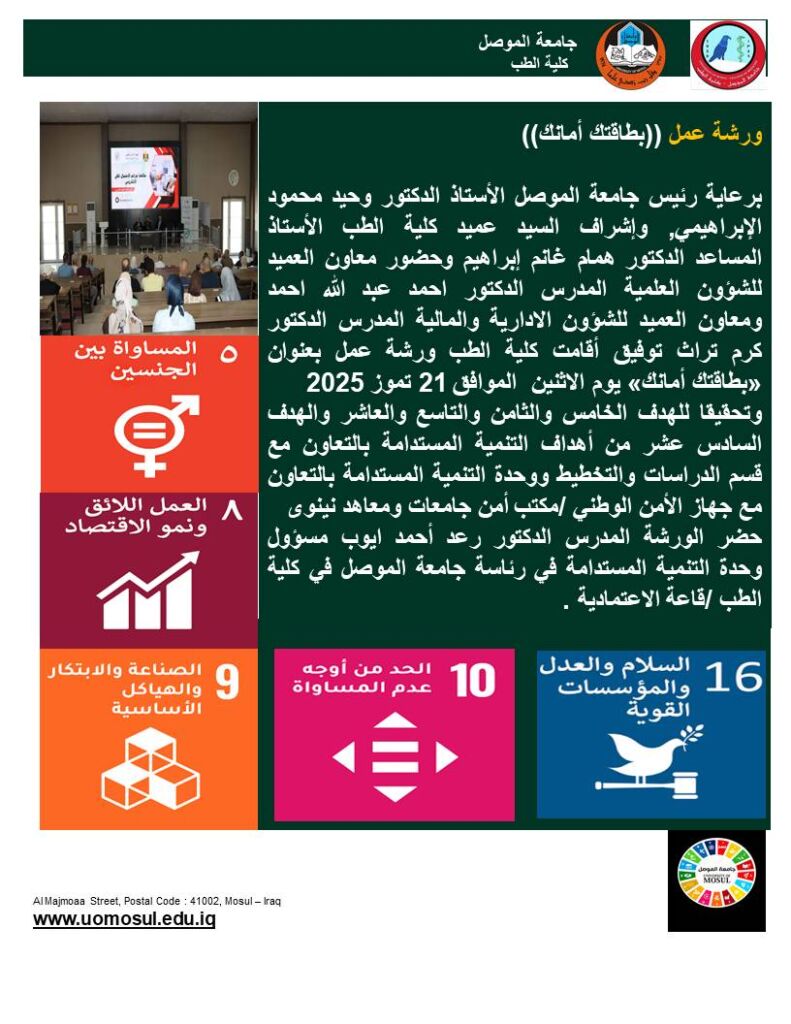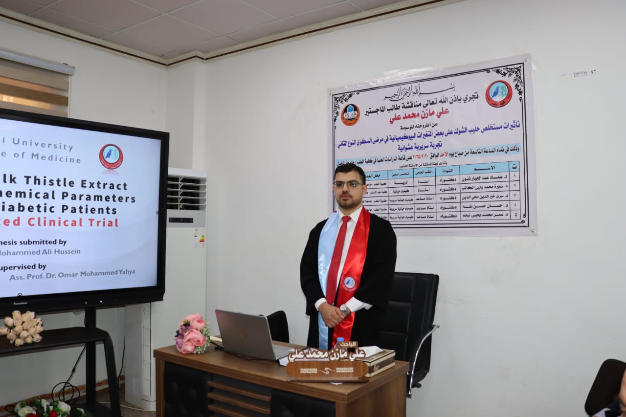 جرت في كلية الطب جامعة الموصل مناقشة رسالة ماجستير للطالب علي مازن محمد علي بعنوان “تأثيرات مستخلص حليب الشوك على بعض المتغيرات البيوكيميائية في مرضى السكري النوع الثاني: تجربة سريرية عشوائية” يوم الأحد الموافق 20 تموز 2025.