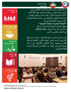 برعاية السيد رئيس جامعة الموصل الأستاذ الدكتور وحيد محمود الإبراهيمي ، وبإشراف السيد عميد كلية الطب الأستاذ المساعد الدكتور همام غانم إبراهيم ، وبالتعاون مع قسم الدراسات والتخطيط /وحدة التنمية المستدامة وشعبة التأهيل والتوظيف في رئاسة جامعة الموصل ، أقيمت ورشة عمل بعنوان “الصحة الجنسية والصحة الإنجابية” وذلك تحقيقا لأهداف التنمية المستدامة (1-5) وذلك يوم الأربعاء الموافق 23/7/2025.