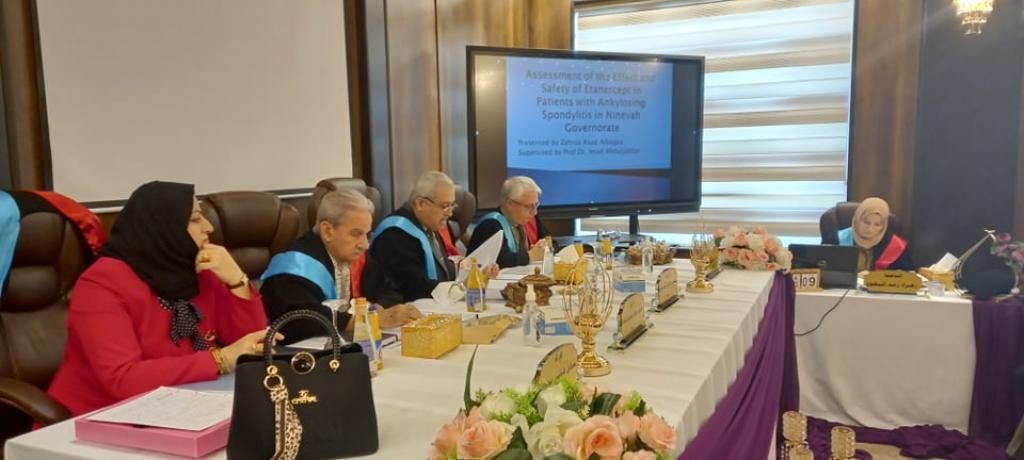 ناقشت كلية الطب جامعة الموصل رسالة ماجستير لفرع علم الأدوية عن تقييم فعالية وسلامة ايتائرسيبت في المرضى الذين يعانون من التهاب الفقار اللاصق في محافظة نينوى، التي تقدّمت بها الطالبة زهراء رعد البكوع، وذلك يوم الخميس 9 أيلول 2021.