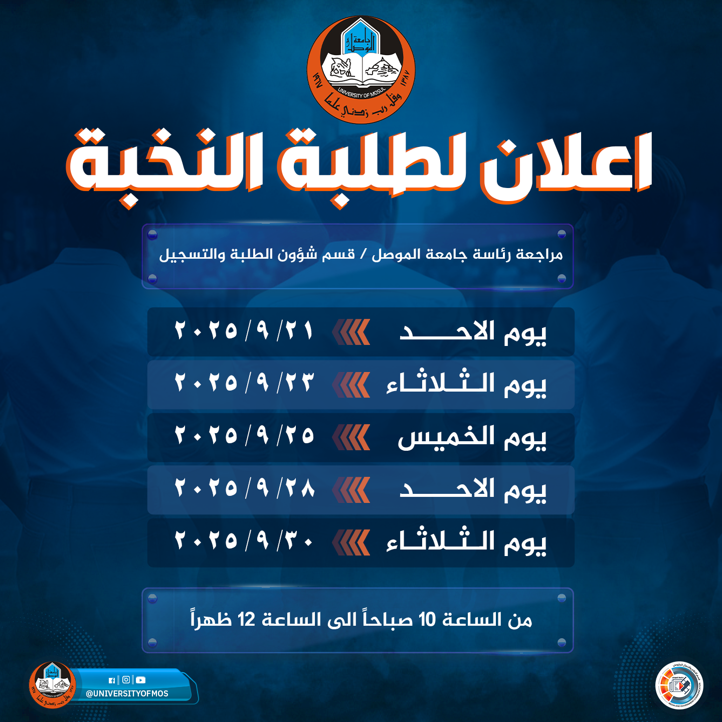 تدعو رئاسة جامعة الموصل طلبة النخبة الذين أكملوا عملية التقديم عبر الرابط الإلكتروني إلى مراجعة قسم شؤون الطلبة والتسجيل في رئاسة الجامعة لإجراء المقابلة، وذلك [إقرأ المزيد]