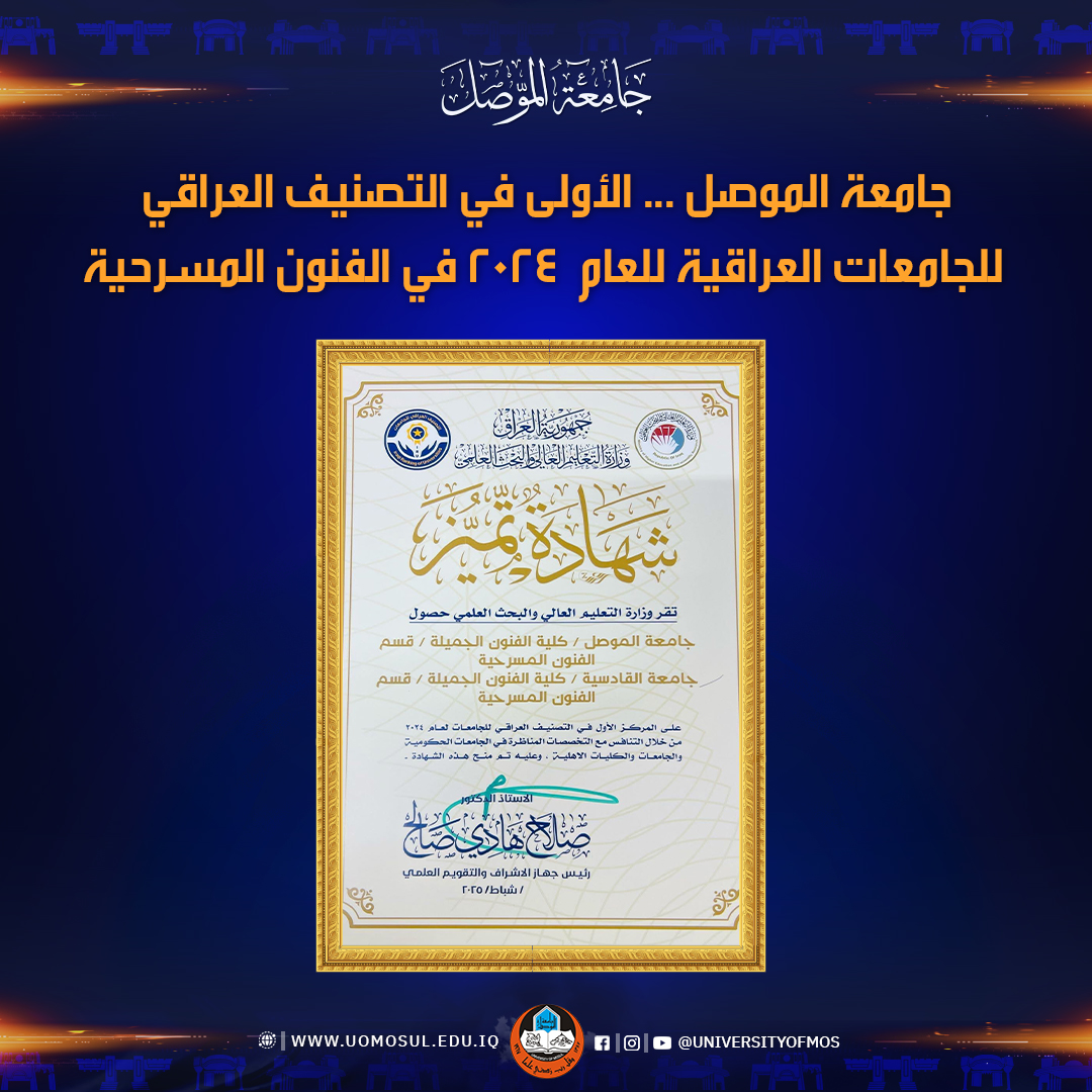 تألق جديد تسجله جامعة الموصل وفي كلية الفنون الجميلة/ قسم الفنون المسرحية بحصوله على شهادة تميز من جهاز الإشراف والتقويم العلمي في وزارة التعليم العالي [إقرأ المزيد]