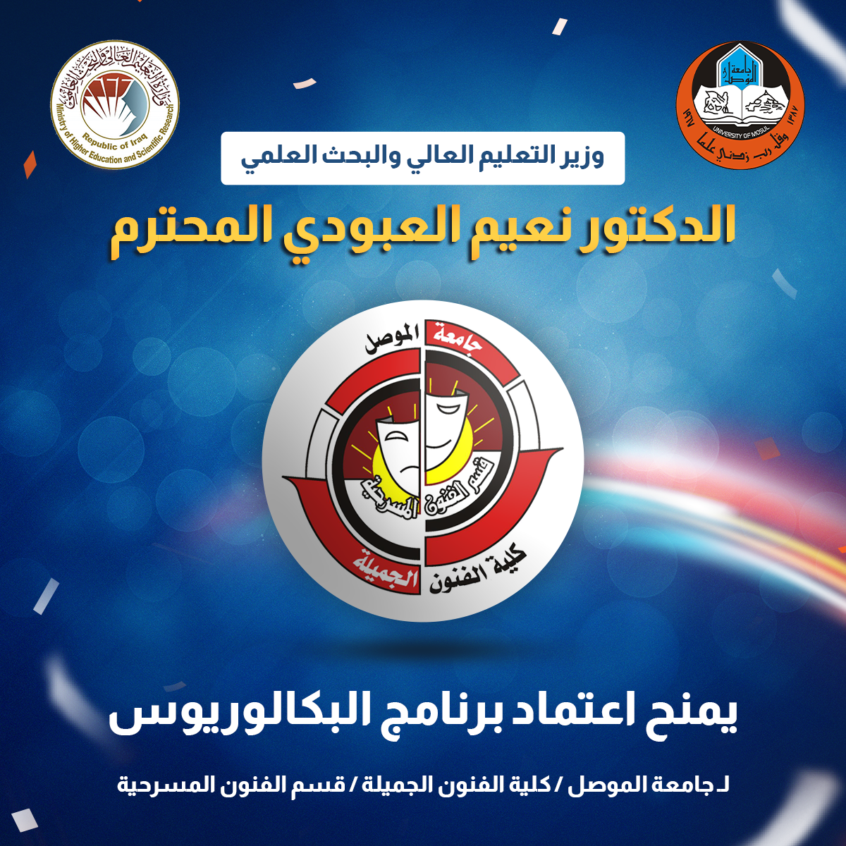 أعلنت كلية الفنون الجميلة في جامعة الموصل عن حصول قسم الفنون المسرحية على الاعتمادية الأكاديمية الوطنية، كأول قسم في كليات الفنون الجميلة في العراق. [إقرأ المزيد]