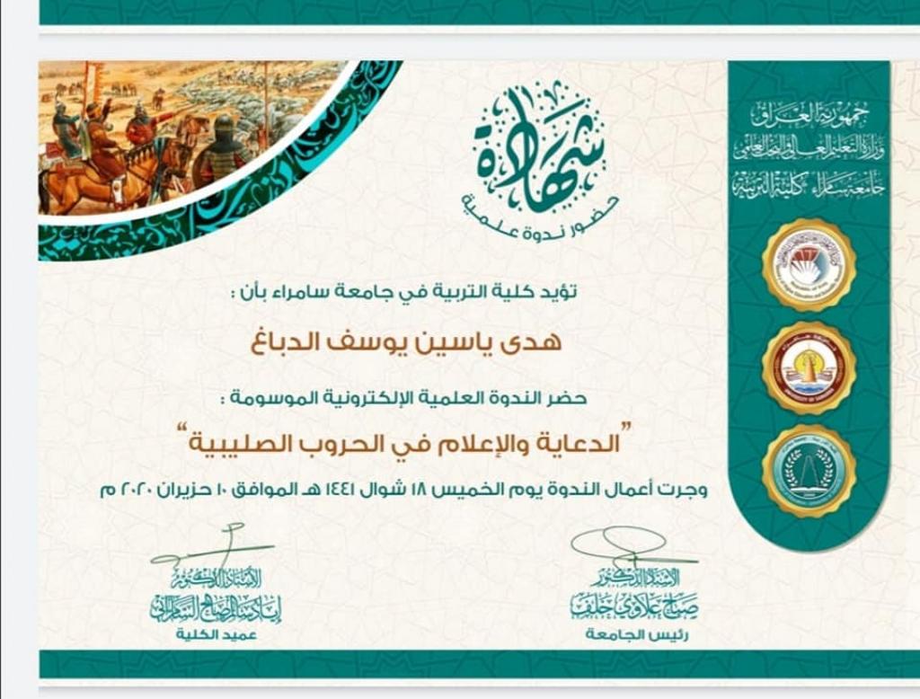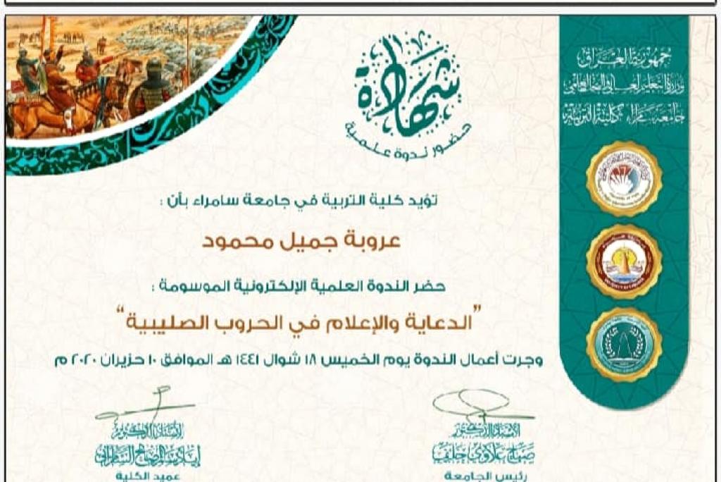 على شهادة حضور الندوة العلمية الدولية الافتراضية الثالثة التي اقامها قسم التاريخ بكلية التربية بجامعة سامراء والمعنونة: (الدعاية والاعلام في الحروب الصليبية) والتي جرت يوم الخميس الموافق ١٠ حزيران ٢٠٢٠ على منصة Zoom الالكترونية . وقد سلطت الندوة الضوء على اساليب الدعاية للحروب الصليبية وأهميتها في تحقيق الاهداف وكشف نصوص المؤرخين في ذلك.