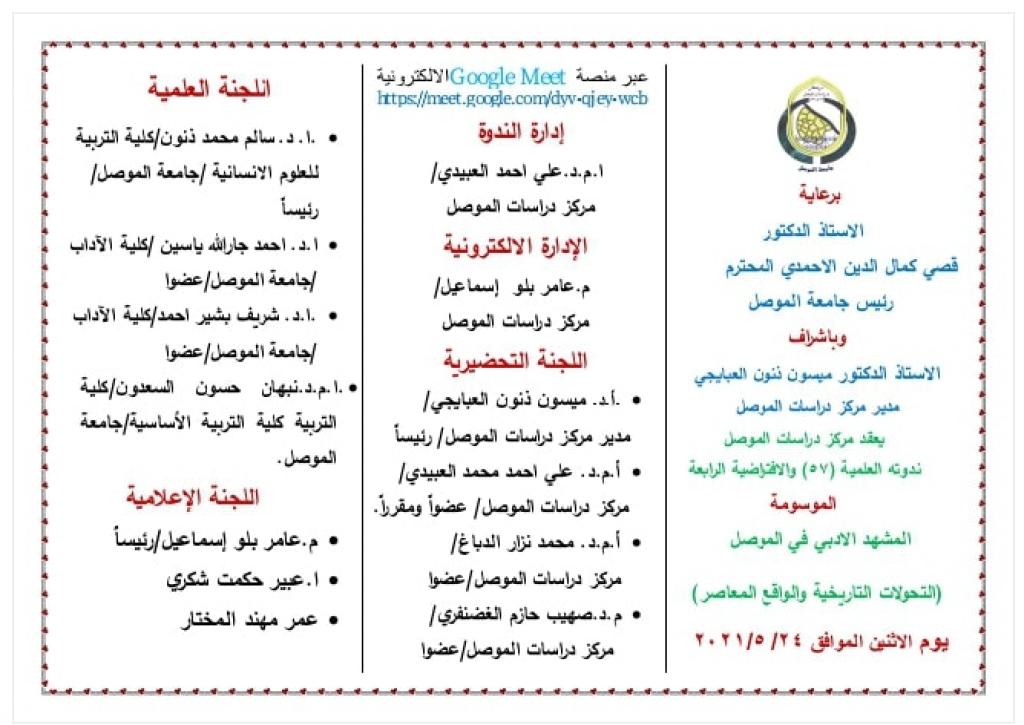 برعاية الاستاذ الدكتور قصي كمال الدين الاحمدي المحترم رئيس جامعة الموصل وباشراف الاستاذ الدكتور ميسون ذنون العبايجي مدير مركز دراسات الموصل يعقد مركز دراسات الموصل ندوته العلمية (57) والافتراضية (4) الموسومة : (المشهد الادبي في الموصل- التحولات التاريخية والواقع المعاصر) وذلك يوم الاثنين الموافق ٢٤ أيار ٢٠٢١ في تمام الساعة الثامنة مساءيدير الندوة الاستاذ المساعد الدكتور علي احمد العبيدي ويديرها الكترونياً المدرس عامر بلو اسماعيل وعلى الرابط https://meet.google.com/dyv-qjey-wcbملاحظة : يمنح الحضور شهادة مشاركة بالندوة