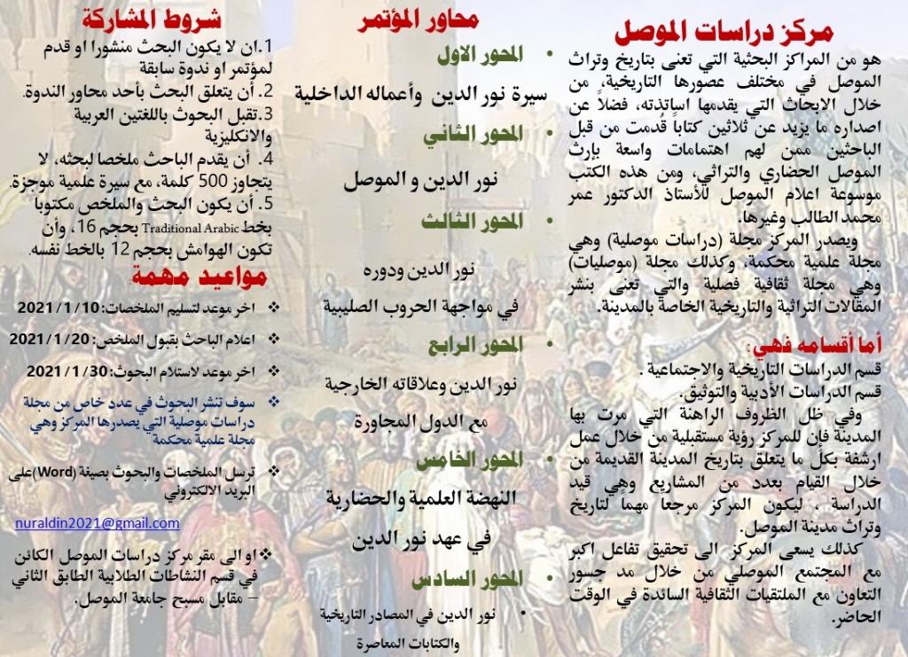 برعاية الاستاذ الدكتور قصي كمال الدين الاحمدي المحترم رئيس جامعة الموصل وبإشراف الاستاذ الدكتور ميسون ذنون العبايجي مدير مركز دراسات الموصل يعقد مركز دراسات الموصل مؤتمره العلمي الرابع والافتراضي الدولي الاول المـوسـوم (الدولة النورية بين التكوين والنهوض) والذي ينعقد ما بين 24-25 شباط 2021
