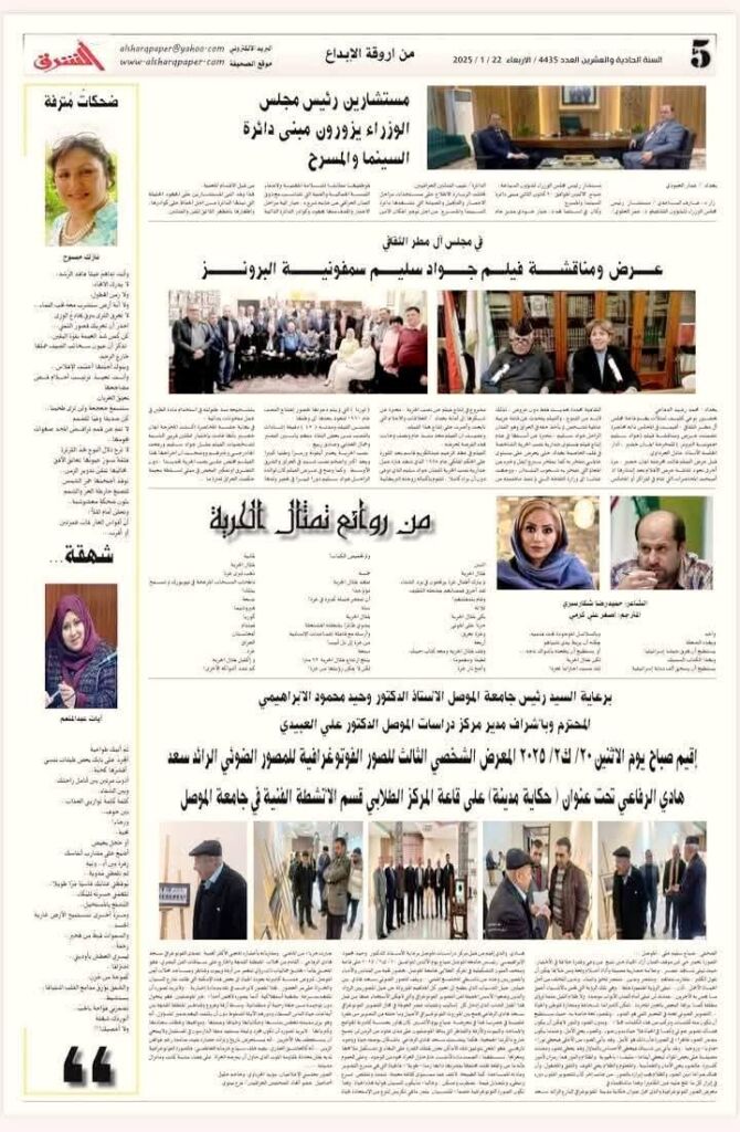 برعاية الاستاذ الدكتور وحيد محمود الابراهيمي رئيس جامعة الموصل المحترم وبإشراف الاستاذ المساعد الدكتور علي احمد العبيدي مدير مركز دراسات الموصل المحترم ، اقام مركز دراسات الموصل بالتعاون مع الفوتغرافي الاستاذ سعد هادي الرفاعي معرض التصوير الفوتغرافي الثالث الموسوم (حكاية مدينة) للمدة من 20-21 كانون الثاني 2025 في قاعة معرض الفنون التشكيلية (المركز الطلابي) /قسم النشاطات الفنية-رئاسة جامعة الموصل والذي ضم اكثر من 54 لوحة فوتغرافية جسدت حكاية مدينة اسمها (الموصل) بكل تفاصيل الحياة اليومية تاريخيا وتراثيا وفلكلوريا وعماريا وفنيا ومهنيا ودينيا وثفافيا ، في لقطات جسدت في لوحات اتسمت بالدقة والحرفية والخبرة العملية في فن التصوير الفوتغرافي ، وقد حضر المعرض عدد من الباحثين المهتمين بتراث وفنون المدينة من الكوادر الأكاديمية في جامعة الموصل وطلابها. وقد قام بالتغطية الإعلامية للمعرض كل من: اتحاد الصحفيين العراقيين/فرع نينوى وقناة راديو الغد وقناة العراقية التركمانية .