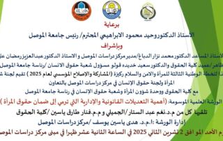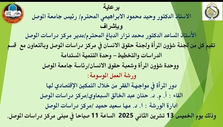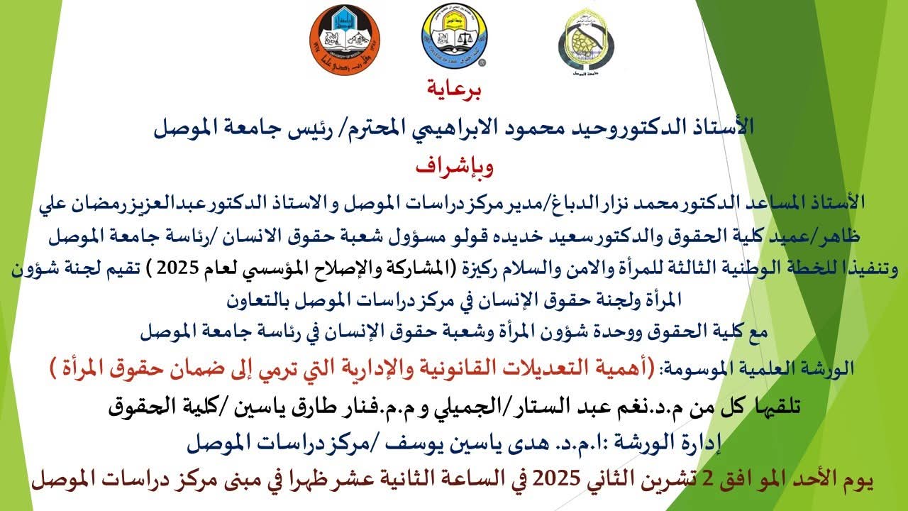 #ورشة_عمل ........ برعاية الاستاذ الدكتور وحيد محمود الابراهيمي رئيس جامعة الموصل وبإشراف الاستاذ المساعد الدكتور محمد نزار الدباغ مدير مركز دراسات الموصل تقيم كل من لجنة شؤون المرأة ولجنة حقوق الانسان في مركز دراسات الموصل [إقرأ المزيد]