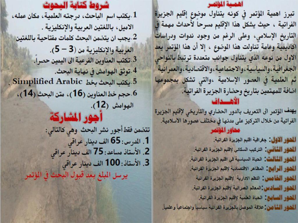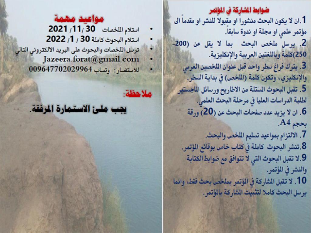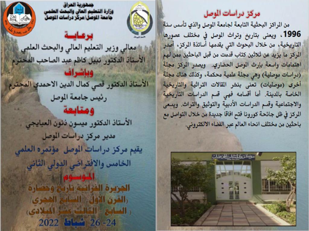 يقيم مركز دراسات الموصل بجامعة الموصل مؤتمره العلمي الخامس والافتراضي الدولي الثاني والموسوم (الجزيرة الفراتية تاريخ وحضارة) للمدة من 24-26 شباط 2022