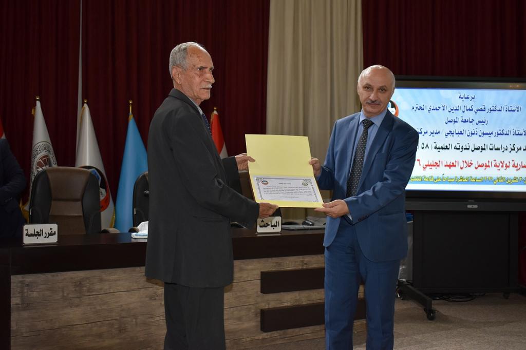 برعاية السيد رئيس جامعة الموصل الاستاذ الدكتور قصي كمال الدين الاحمدي وحضور الاستاذ المساعد الدكتور وحيد محمود الابراهيمي مساعد رئيس الجامعة للشؤون الادارية ممثلا عن رئيس جامعة الموصل وبإشراف مدير مركز دراسات الموصل الاستاذ الدكتور ميسون ذنون العبايجي اقام مركز دراسات الموصل ندوته العلمية 58 والموسومة : (السمات الحضارية لولاية الموصل خلال العهد الجليلي ١٧٦٢-١٨٣٤م) الثلاثاء الموافق ٣٠ تشرين الثاني ٢٠٢١ في تمام الساعة ١٠ صباحا على قاعة المنتدى العلمي الادبي في جامعة الموصلواستهلت الندوة بآي من الذكر الحكيم تلاها القارئ الدكتور عبد الملك سليمان مدير قسم النشاطات الطلابية رئاسة جامعة الموصل . واعقبها كلمة اللجنة التحضيرية قدمتها الاستاذ المساعد الدكتور ميسون ذنون العبايجي مدير مركز دراسات الموصل. تلاها كلمة المهندس الاستاذ سنان عبدالله الجليلي ممثلا عن الاسرة الجليلية ثم المحاضرة الافتتاحية عن تاريخ الاسرة الجليلية في الموصل قدمها الاستاذ الدكتور ابراهيم العلاف استاذ التاريخ الحديث المتمرس بجامعة الموصل.تلاها توزيع الشهادات التقديرية على المشاركين في اعمال هذه الندوة قدمها السيد مساعد رئيس الجامعة للشؤون الادارية الاستاذ المساعد الدكتور وحيد محمود الابراهيمي .قسمت الندوة الى عدة محاورالمحور الأول: طبيعة نظام الحكم والتشكيلات الاداريةالمحور الثاني: تطور الفنون والآدابالمحور الثالث: ازدهار العمران وبناء المساجدالمحور الرابع: نمو حركة التأليف والتدوين التاريخيالمحور الخامس: انتعاش اقتصاديات ولاية الموصلالمحور السادس: بوادر النزوع القومي في الموصلالمحور السابع :حركة الاصلاح الديني وآثارها على المنطقة العربية.قدم في هذه الندوة اثني عشر بحثا وورقة بحثية وزعت على جلستين ، ضمت الجلسة الاولى خمسة بحوث وجاءت الجلسة الثانية بواقع سبعة بحوث .هدفت الى إبراز نهضة الموصل خلال العهد الجليلي وما شهدته من استقرار في الاوضاع المختلفة وتطور التشكيلات الادارية والتحولات الاقتصادية وزيادة النتاجات الادبية وازدهار التدوين بمكوناته المعرفية المختلفة ، وتطور المفاهيم والآراء ونضوج عوامل الاصلاح الديني والاجتماعي في الوقت الذي ذاع صيتها في الولايات العربية خلال القرن الثامن عشر .واستمرت اعمال هذه الندوة اكثر من اربعة ساعات متواصلة حضرها جمع كبير من الباحثين والمهتمين بتاريخ وتراث الموصل منهم الاب رائد عادل كلو رئيس كنائس الموصل والاثاري عبدالله امين اغا ، والاستاذ الدكتور غانم سعيد والاستاذ عماد غانم الربيعي والاستاذ المهندس سعد سعيد الديوه جي والاستاذ سعد المصري والاستاذ ميسر ذنون والدكتور فراس غانم والنحات طلال صفاوي وغيرهم.فضلا عن عدد من شخصيات الاسرة الجليلية في المدينة وهم كل من الاستاذ زياد الجليلي والاستاذ عبد العزيز الجليلي والاستاذ سنان الجليلي والاستاذ مراد الجليلي والدكتور حسن طلال الجليلي والاستاذ الحقوقي سعود الجليلي .وبعد الانتهاء من قراءة ملخصات الابحاث دارت مجموعة من الحوارات والمناقشات حول ما قدم في هذه الندوة كان منها بعض الطروحات التي قدمها الاستاذ الدكتور جزيل عبد الجبار الجومرد والاستاذ محمد توفيق الفخري والاستاذ المهندس سنان عبدالله الجليلي والباحث ياسين عبد اللطيف البدراني فضلا عن مجموعة من التوصيات والمقترحات التي قدمها الاساتذة الحاضرون فضلا عن مجموعة من المقترحات والتوصيات التي خرجت بها الندوة تمثل رؤية مركز دراسات الموصل وهي :1. ضرورة تعاون الاسرة الجليلية مع جامعة الموصل ممثلة بمركز دراسات الموصل من خلال تزويده بالوثائق الخاصة بالاسرة لتكون متاحة للباحثين والمهتمين بتاريخ هذه الاسرة .