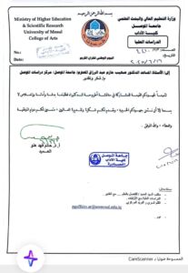 تدريسي من مركز دراسات الموصل يمنح شكر وتقدير من عميد كلية الاداب