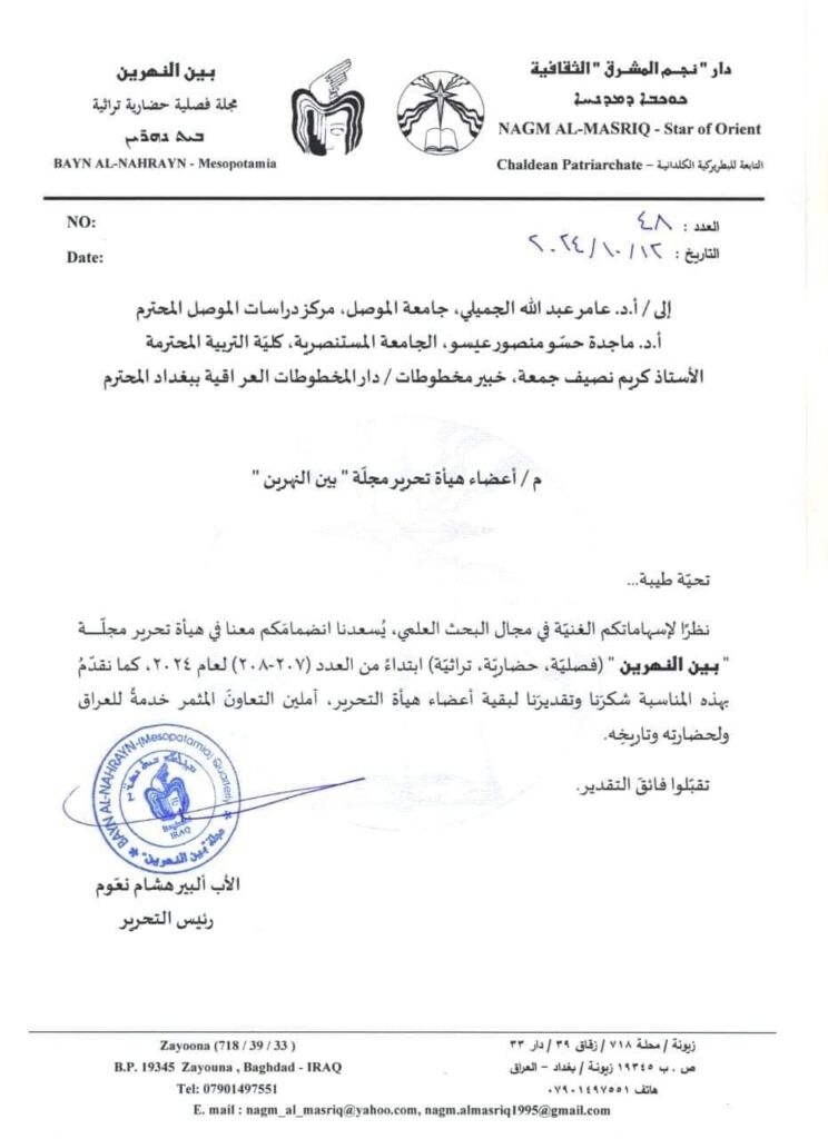 تكريم مدير مركز دراسات الموصل بشهادة تقديرية من جمعية الراسخ التقني العلمية