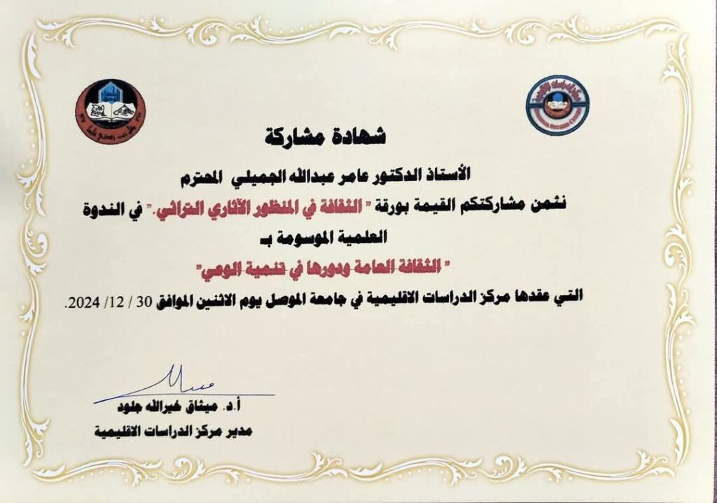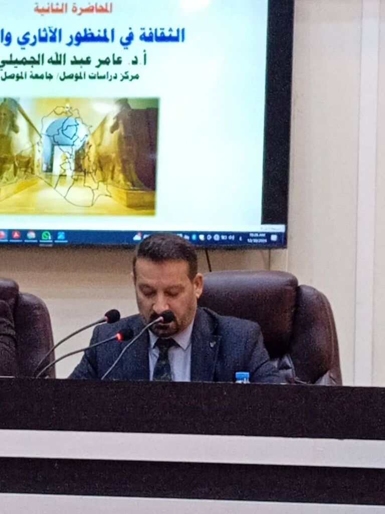 ضمن سعي ادارة مركز دراسات الموصل لمتابعة الانشطة الخارجية لاساتذته حضر مدير مركز دراسات الموصل ا.م.د.علي احمد العبيدي رفقة م.م.مهدي صالح سعيد التدريسي في قسم الدراسات الأدبية والتوثيق جانبا من الندوة العلمية(59)التي أقامها مركز الدراسات الاقليمية بجامعة الموصل على قاعة عمادة كلية العلوم الإسلاميةوالتي حملت عنوان( الثقافة العامة ودورها في تنمية الوعي )وذلك يوم الإثنين الموافق 30 كانون الاول2024 من خلال تمثيل ومشاركة الاستاذ الدكتور عامر عبدالله الجميلي التدريسي في مركز دراسات الموصل من خلال اسهامه بورقة العمل الموسومة : ” الثقافة في المنظور الآثاري والتراثي “.
