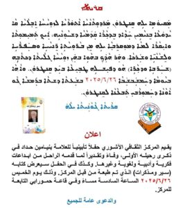 ضمن سعي مركز دراسات الموصل للانفتاح على المكونات شارك ا.د.عامر عبدالله الجميلي رئيس لجنة العلاقات الثقافية والتدريسي في قسم الدراسات الأدبية والتوثيق بحفل تأبين الراحل للعَلّامة ܒܢܝܡܝܢ ܚܕܐܕ بنيامين حداد في ذكرى رحيله الأولى في المركز الثقافي الآشوري في دهوك وفاءاً وتقديراً لما قدمه الراحل من إبداعات فكرية وأدبية ولغوية وتراثية وغيرها ، واشتمل الحفل على كلمات القيت من فعاليات وشخصيات ومن بينها أسرة الفقيد وكذلك تم تقديم عرض واستعراض لكتابه الأخير ( سير وذكريات ) الذي تم طبعه على نفقة المركز الثقافي الآشوري .
