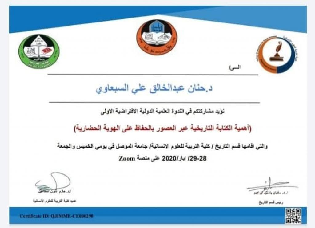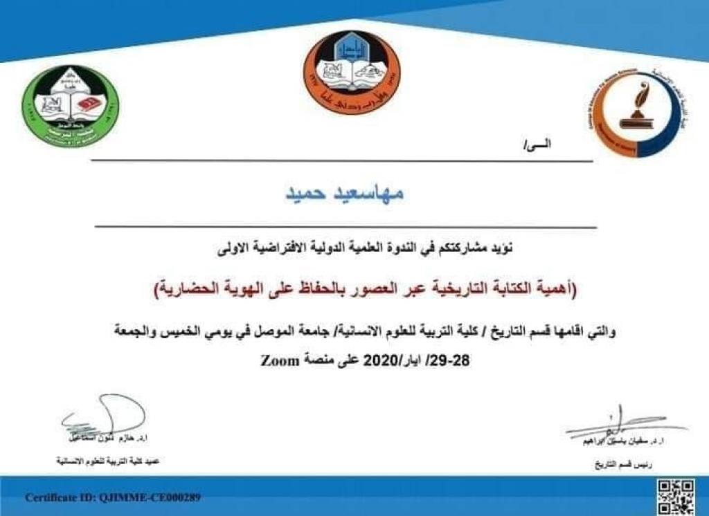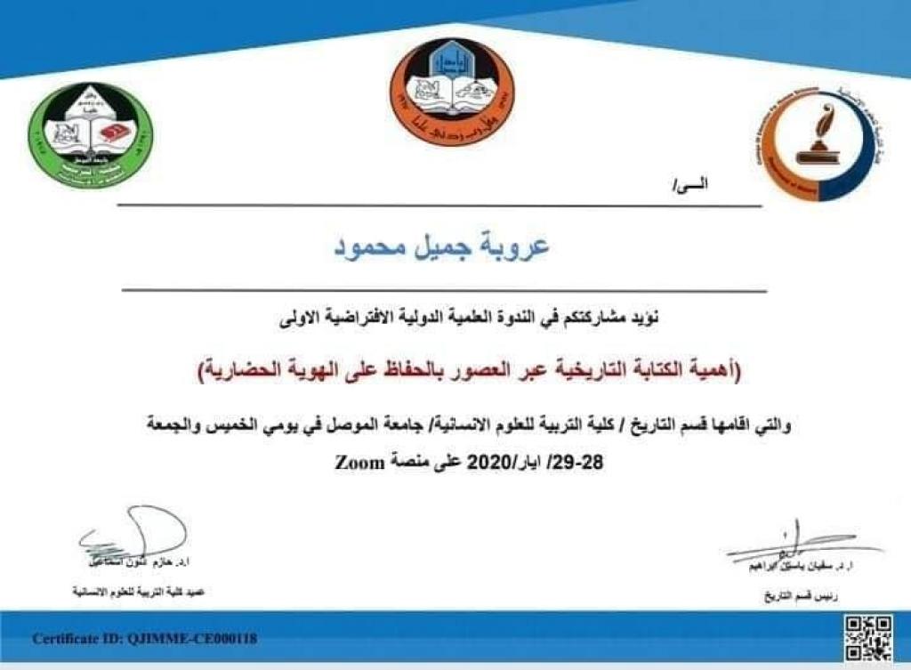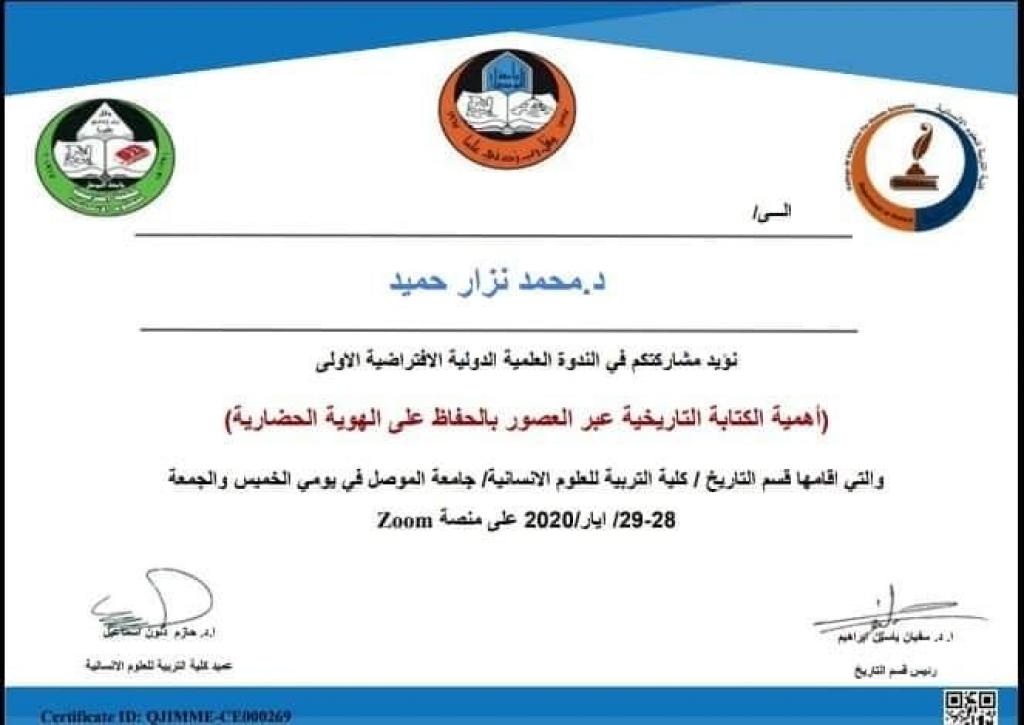 حصل عدد من أساتذة مركز دراسات الموصل على شهادات مشاركة إلكترونية لحضورهم الندوة العلمية الدولية الافتراضية الأولى التي نظمها قسم التاريخ في كلية التربية للعلوم الانسانية بجامعة الموصل والموسومة (أهمية الكتابة التاريخية عبر العصور للحفاظ على الهوية الحضارية) للمدة ٢٨-٢٩ أيار ٢٠٢٠ عبر منصة zoom الإلكترونية