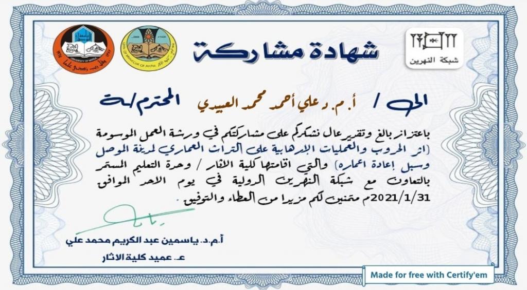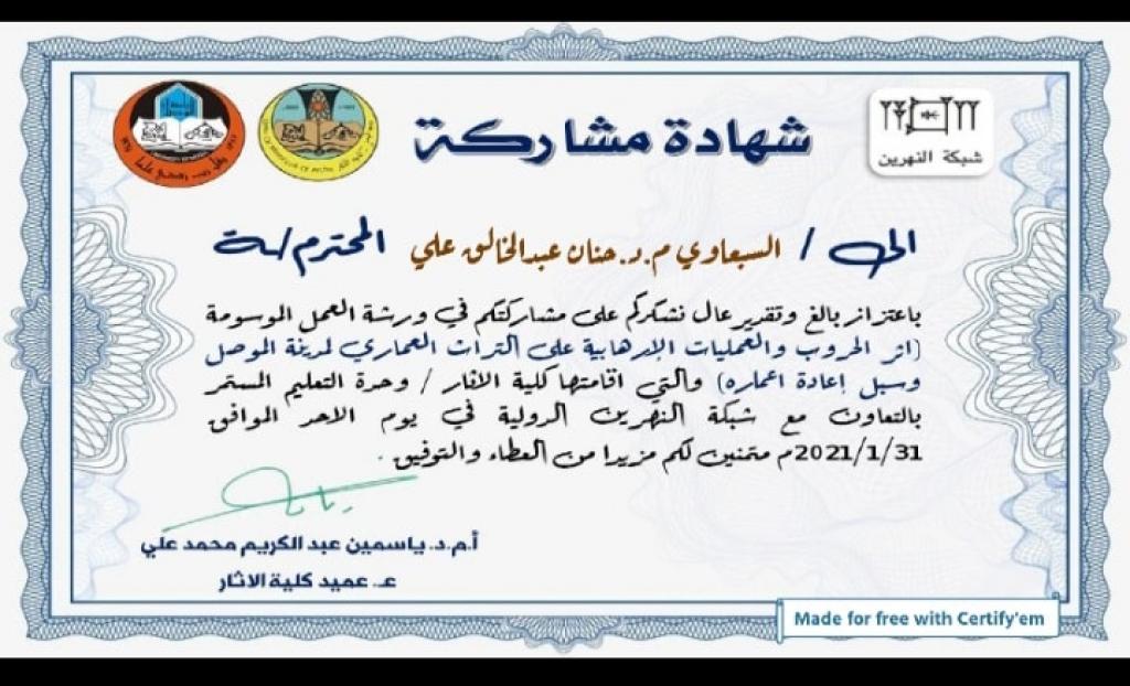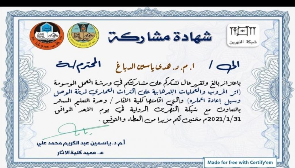 شارك مجموعة من أساتذة مركز دراسات الموصل في جامعة الموصل من خلال حضورهم ومتابعتهم للمداخلات البحثية بأعمال ورشة العمل التي أقامتها كلية الآثار في جامعة الموصل وبالتعاون مع شبكة النهرين الدولية الموسومة (أثر الحروب والعمليات الإرهابية على التراث المعماري لمدينة الموصل وسبل إعادة إعماره) في يوم الأحد الموافق ٣١ كانون الثاني ٢٠٢١ في الساعة الثامنة مساءً عبر الفضاء الافتراضي وتطبيق google meet.وتأتي أهمية الورشة في أنها تحدثت عن أثر النزاعات المسلحة وتأثيرها على التراث الثقافي والعمراني وتضمنت أهمية الورشة في أنها دعت الى السبل الواردة من قبل المجتمعات والمنظمات الدولية والتي من شأنها صيانة واعمار هذا الإرث الثقافي والحضاري لمدينة الموصل التي شهدت أعمال الصراعات المسلحة وما اعقبها من عمليات التحرير.
