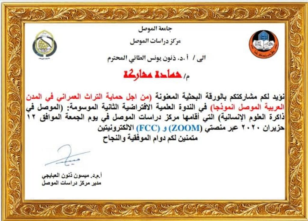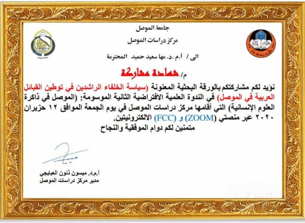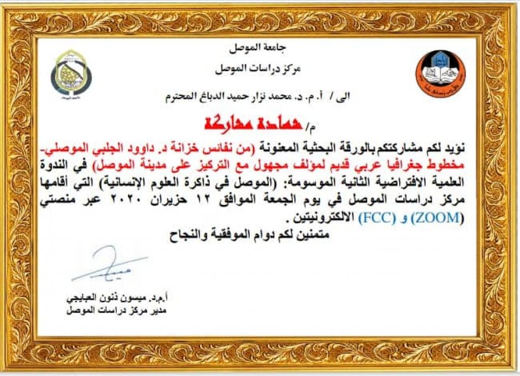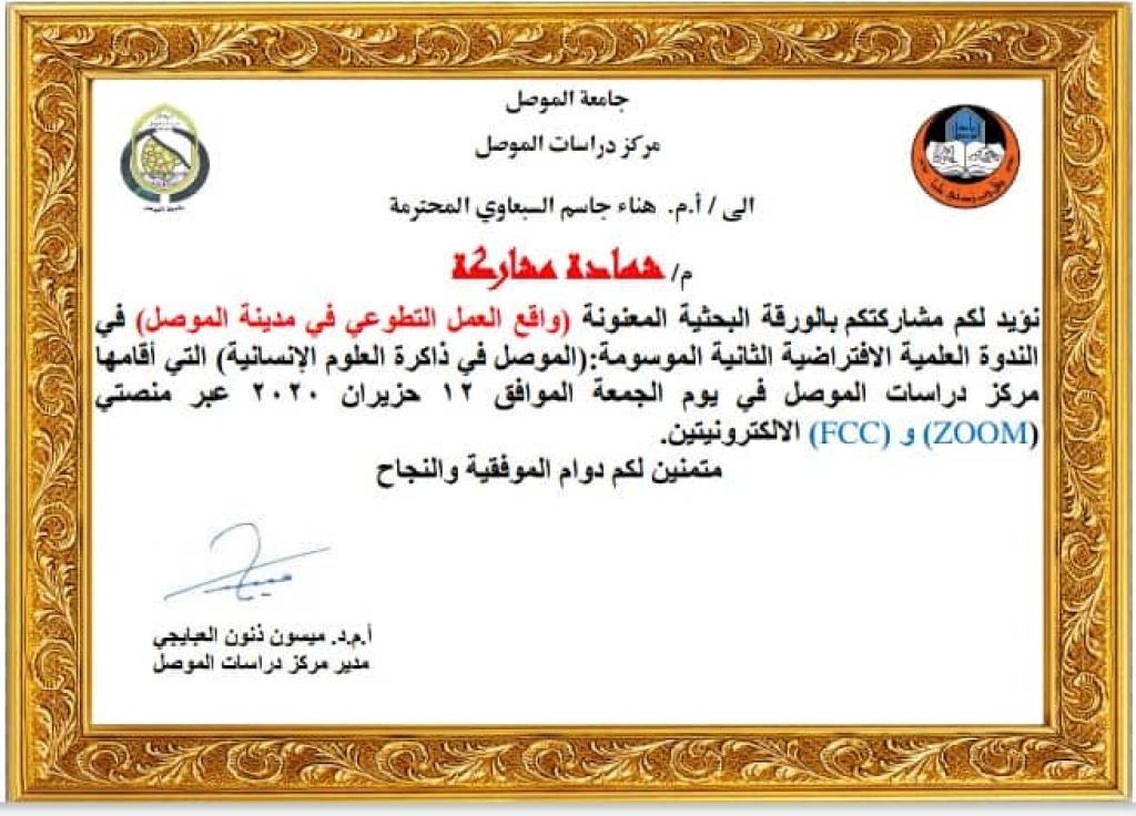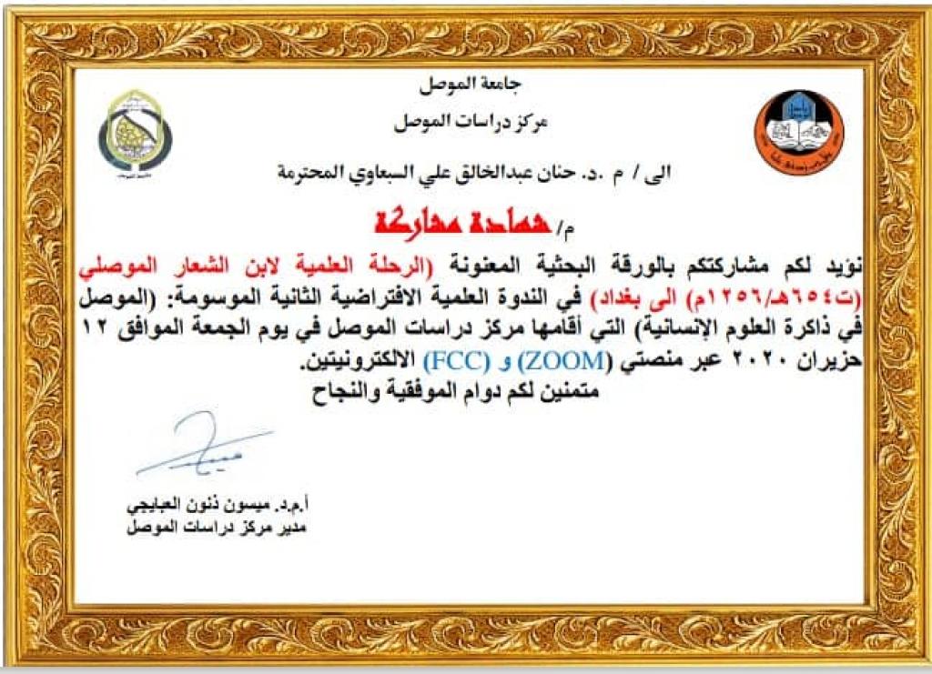 حصل عدد من أساتذة مركز دراسات الموصل على شهادة مشاركة الكترونية لحضورهم الفاعل ومشاركتهم باللقاء أوراقهم البحثية في الندوة العلمية(55) والافتراضية الثانية الموسومة (الموصل في ذاكرة العلوم الانسانية) التي نظمها مركز دراسات الموصل في يوم الجمعة الموافق 12 حزيران 2020 وبواقع ثلاث جلسات خصصت للتاريخ الاسلامي والتاريخ الحديث وعلم الاجتماع والادب مما له صلة بمدينة الموصل عبر منصتي Zoom و F.C.C الالكترونيتين . حيث ركزت الندوة العلمية على إبراز دور مدينة الموصل في العلوم الانسانية على صعيد عطائها التاريخي والادبي والاجتماعي عبر الحقب التاريخية المختلفة بوصفها احدى اهم الحواضر العربية الاسلامية.