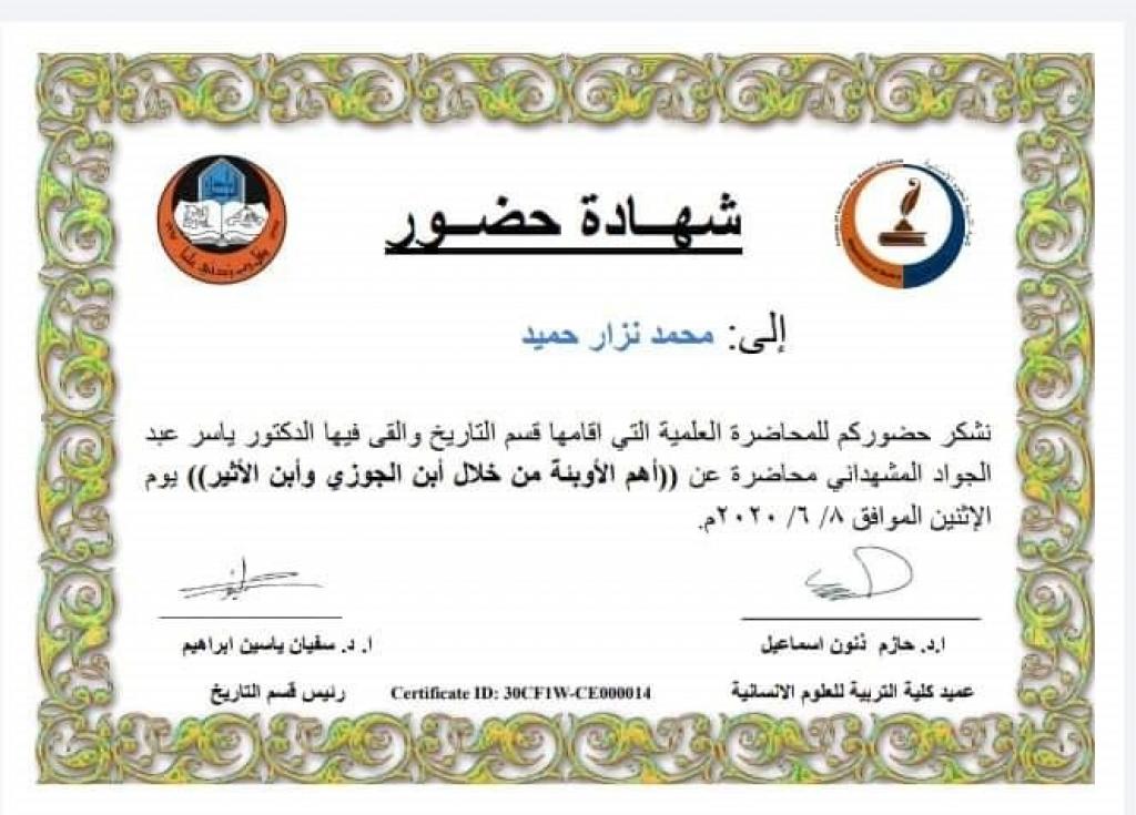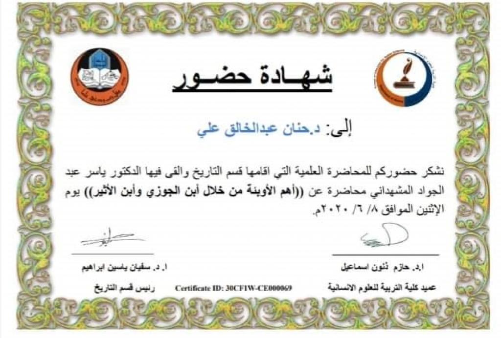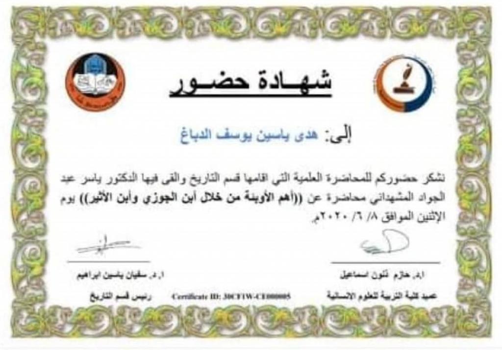 حصل عدد من تدريسي مركز دراسات الموصل على شهادة مشاركة من قسم التاريخ في كلية التريية للعلوم الانسانية بجامعة الموصل ، وهم كل من الاستاذ المساعد الدكتور محمد نزار الدباغ والاستاذ المساعد الدكتور مها سعيد الخفاف والاستاذ المساعد الدكتور هدى ياسين يوسف والمدرس الدكتور حنان عبد الخالق علي وذلك لحضورهم المحاضرة الموسومة (اهم الاوبئة من خلال ابن الجوزي وابن الاثير) للأستاذ الدكتور ياسر عبد الجواد المشهداني، بتاريخ ٨ حزيران ٢٠٢٠ عبر منصة Zoom الالكترونية