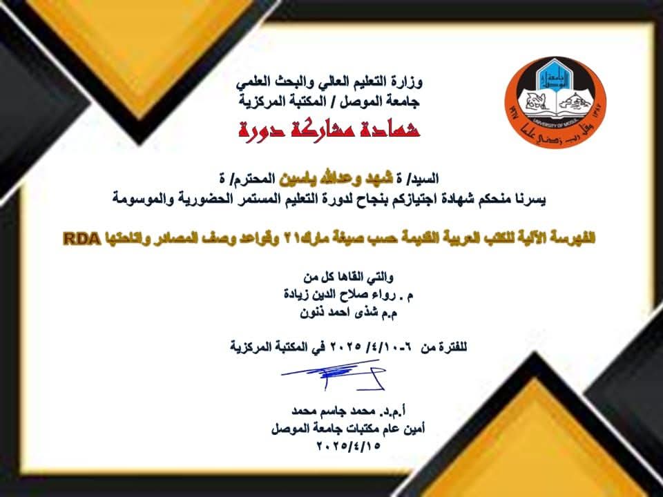 حصلت الانسة شهد وعدالله ياسين مسؤولة مكتبة مركز دراسات الموصل على شهادة مشاركة بعد اجتيازها لدورة التعليم المستمر الحضورية الموسومة :الفهرسة الالية للكتب العربية القديمة حسب صيغة مارك 21 وقواعد وصف المصادر واتاحتها RDA والتي اقامتها المكتبة المركزية – جامعة الموصل للمدة 6 – 10 نيسان 2025 .