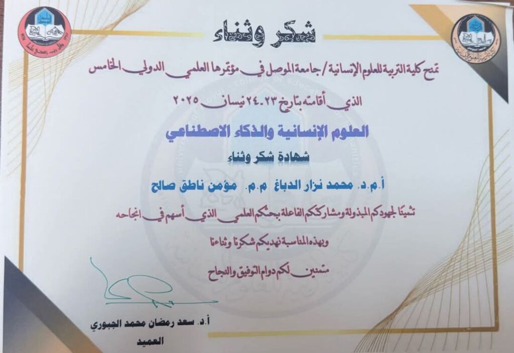 حصل كل من ا.م.د.محمد نزار الدباغ و م.م.مؤمن ناطق صالح التدريسيان في مركز دراسات الموصل على شهادة مشاركة من كلية التربية للعلوم الانسانية/جامعة الموصل لمشاركتهما في مؤتمرها العلمي الدولي الخامس الموسوم : العلوم الانسانية والذكاء الاصطناعي الذي اقامته بتاريخ 23- 24 نيسان 2025 .