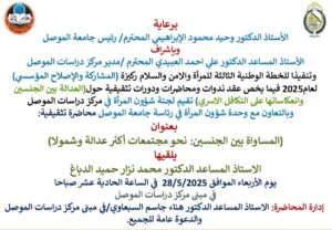 برعاية الاستاذ الدكتور وحيد محمود الإبراهيمي المحترم /رئيس جامعة الموصل وبإشراف الأستاذ المساعد الدكتور علي أحمد العبيدي /مدير مركز دراسات الموصل وتنفيذا للخطة الوطنية الثالثة للمرأة والامن والسلام ركيزة (المشاركة والإصلاح المؤسسي) لعام 2025 فيما يخص عقد ندوات ومحاضرات ودورات تثقيفية حول (العدالة بين الجنسين وانعكاساتها على التكافل الاسري) تقيم لجنة شؤون المرأة في مركز دراسات الموصل وبالتعاون مع وحدة شؤون المرأة في رئاسة جامعة الموصل محاضرة تثقيفية بعنوان(المساواة بين الجنسين : نحو مجتمعات أكثر عدالة وشمولا) يلقيها الاستاذ المساعد الدكتور محمد نزار حميد الدباغ يوم الأربعاء الموافق 28/5/2025في الساعة الحادية عشر صباحا في مبنى مركز دراسات الموصل . إدارة المحاضرة: الاستاذ المساعد الدكتور هناء جاسم السبعاوي والدعوة عامة للجميع.
