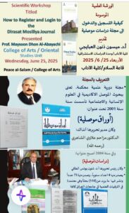 وإدارتها :الأستاذ المساعد الدكتور عروبة جميل محمود /مركز دراسات الموصل وذلك يوم الأربعاء الموافق 25 حزيران 2025 في تمام الساعة العاشرة صباحاً في قاعة السلام/كلية الاداب وبحضور جمع طيب من اساتذة قسم التاريخ وموظفي عمادة كلية الاداب فضلا عن اساتذة مركز دراسات الموصل هدفت الورشة الى تعريف الباحثين بآلية التسجيل والدخول لمجلة دراسات موصلية حيث تم عرض الورشة بشكل عرض تقديمي power point .قسمت الورشة الى ثلاثة محاور هي :